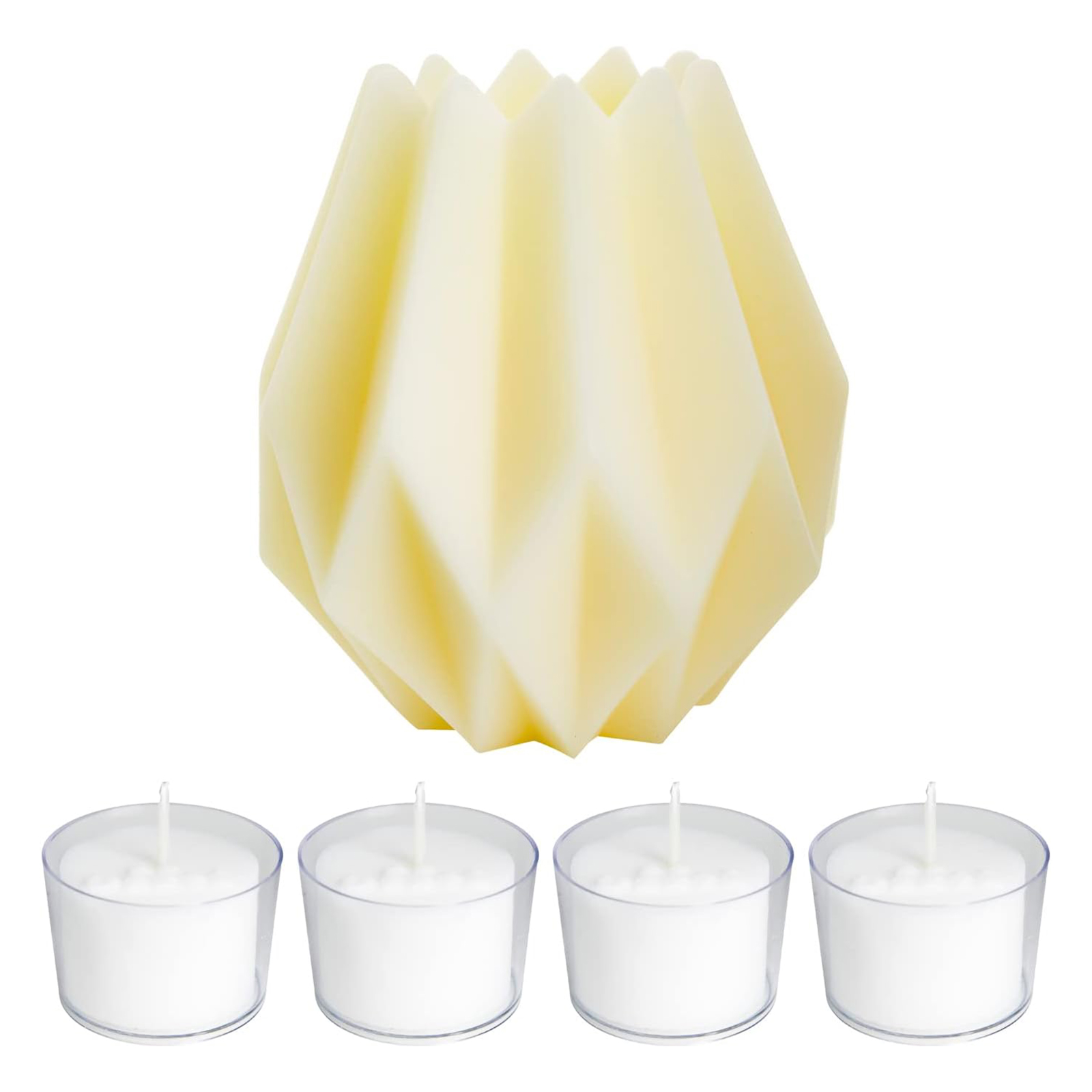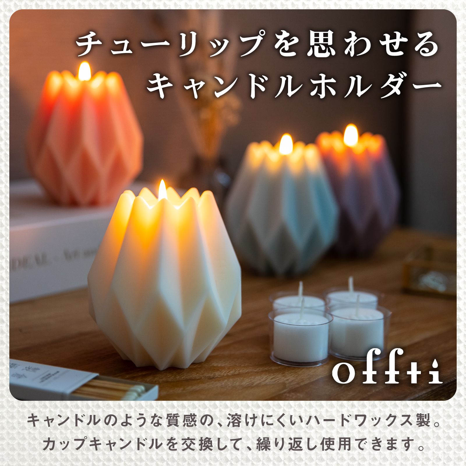チューリップを思わせるデザインのキャンドルホルダーです。あかりがつくる陰影が魅力。インテリアとしてもお楽しみいただけます。キャンドルのような質感の、溶けにくいハードワックス製です。フレグランスカップキャンドルを交換して、繰り返し使用できます。