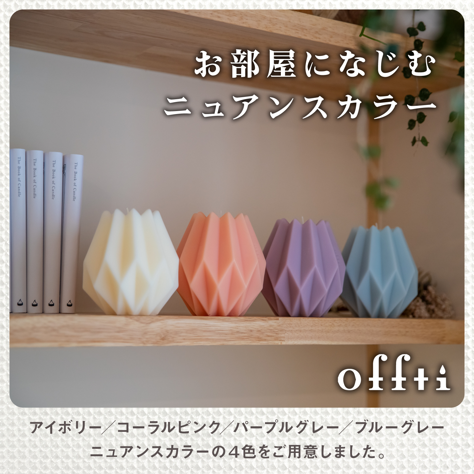 昭和9年創業、国内屈指のキャンドルメーカー:ペガサスキャンドルから手かけたブランドでございます。 自分らしさを取り戻すオフタイムのために生まれた、offti。 背伸びせず香りとあかりを楽しめるアイテムをそろえました。使わないときもインテリアになじみます。 キャンドルメーカーとして商品をお届けするだけでなく、 キャンドルのある空間、その場の心の燈火を創造することを目指しています。