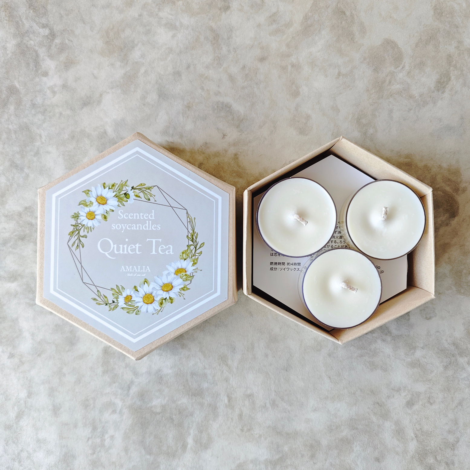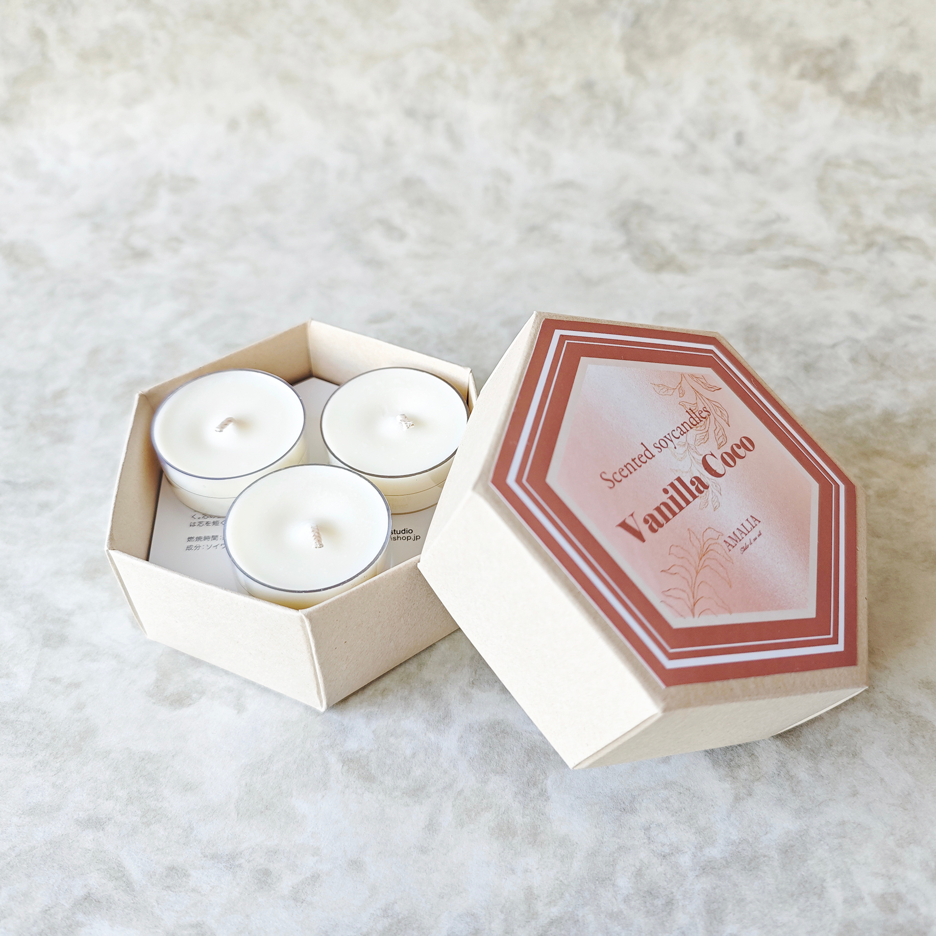 大口注文・法人のお問い合わせはこちらアロマの香りをぎゅっと閉じ込めたティーライトキャンドルセット。 6個セットになっており、お好きな時にキャンドルを楽しめます。六角形のBOXに入っているので、プレゼントにもおすすめです。 アロマの香りは全てオリジナルブレンド、天然製油(エッセンシャルオイル)を使用しているので自然本来の優しい香りが楽しめます。また、キャンドルのロウは、ソイワックスを使用しており、火を灯すと柔らかな灯りがゆらゆらとゆらぐので、リラックスタイムにぴったりです。