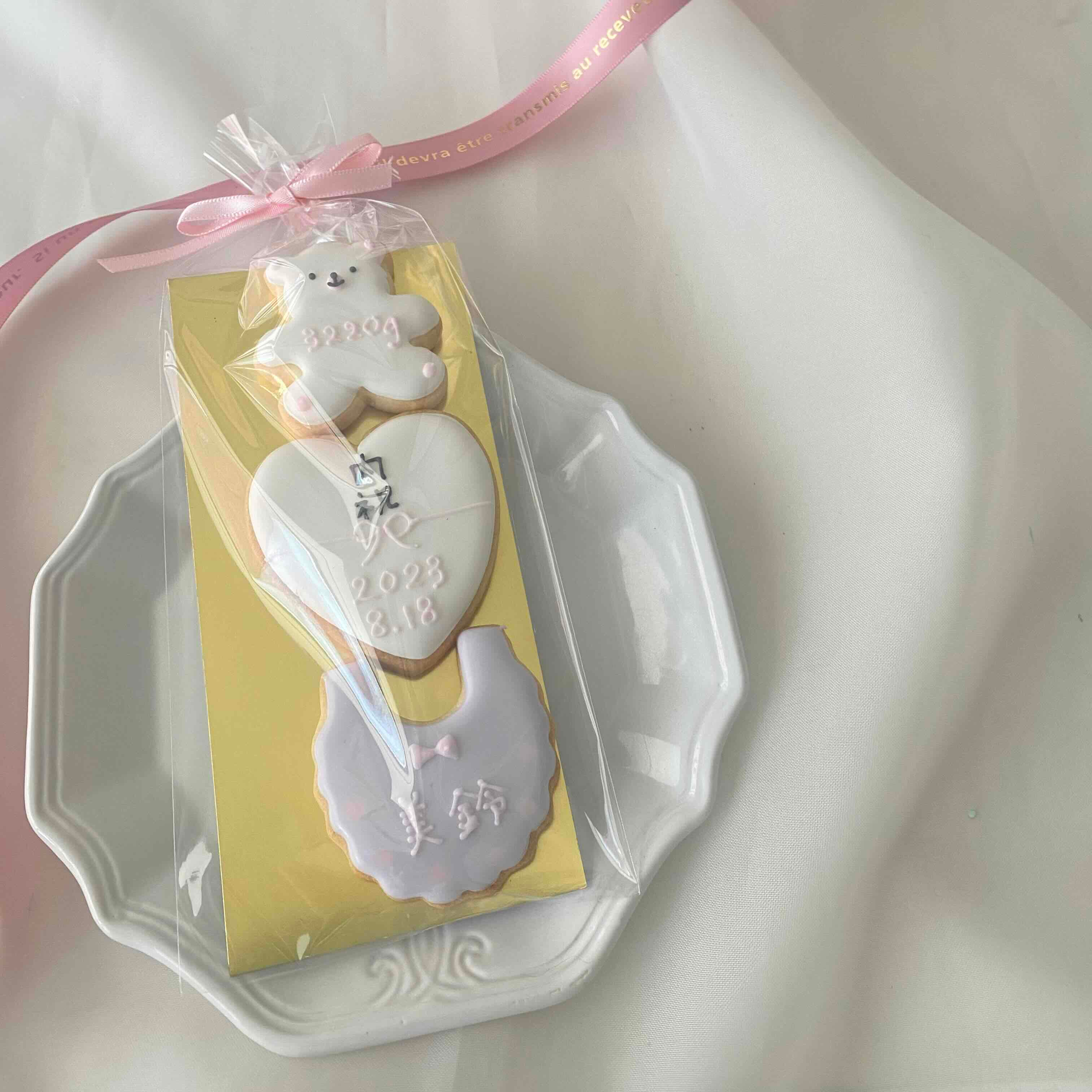 大口注文・法人のお問い合わせはこちら優しいパステルカラーにこだわり、可愛いと美味しいをセットでお客さまに大変喜ばれています。お子さまのお名前や誕生日、体重を入れて特別なギフトになります。 材料にもこだわり、見た目だけでなく食べても美味しいと好評です。やさしい色味も人気のひとつです。お口の中でクッキーのさくほろ感とアイシングの甘みが溶け合います。