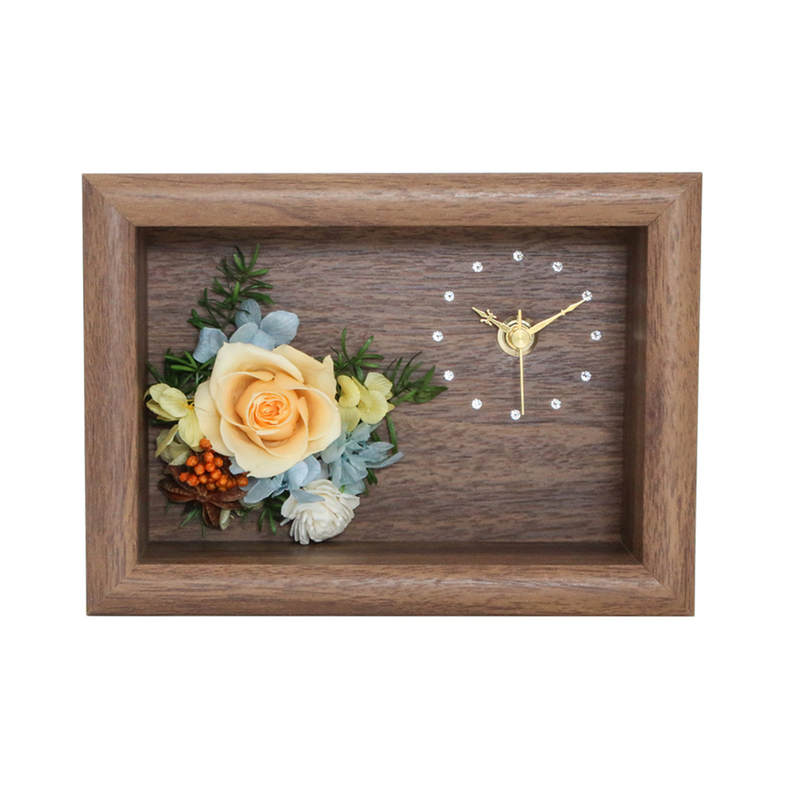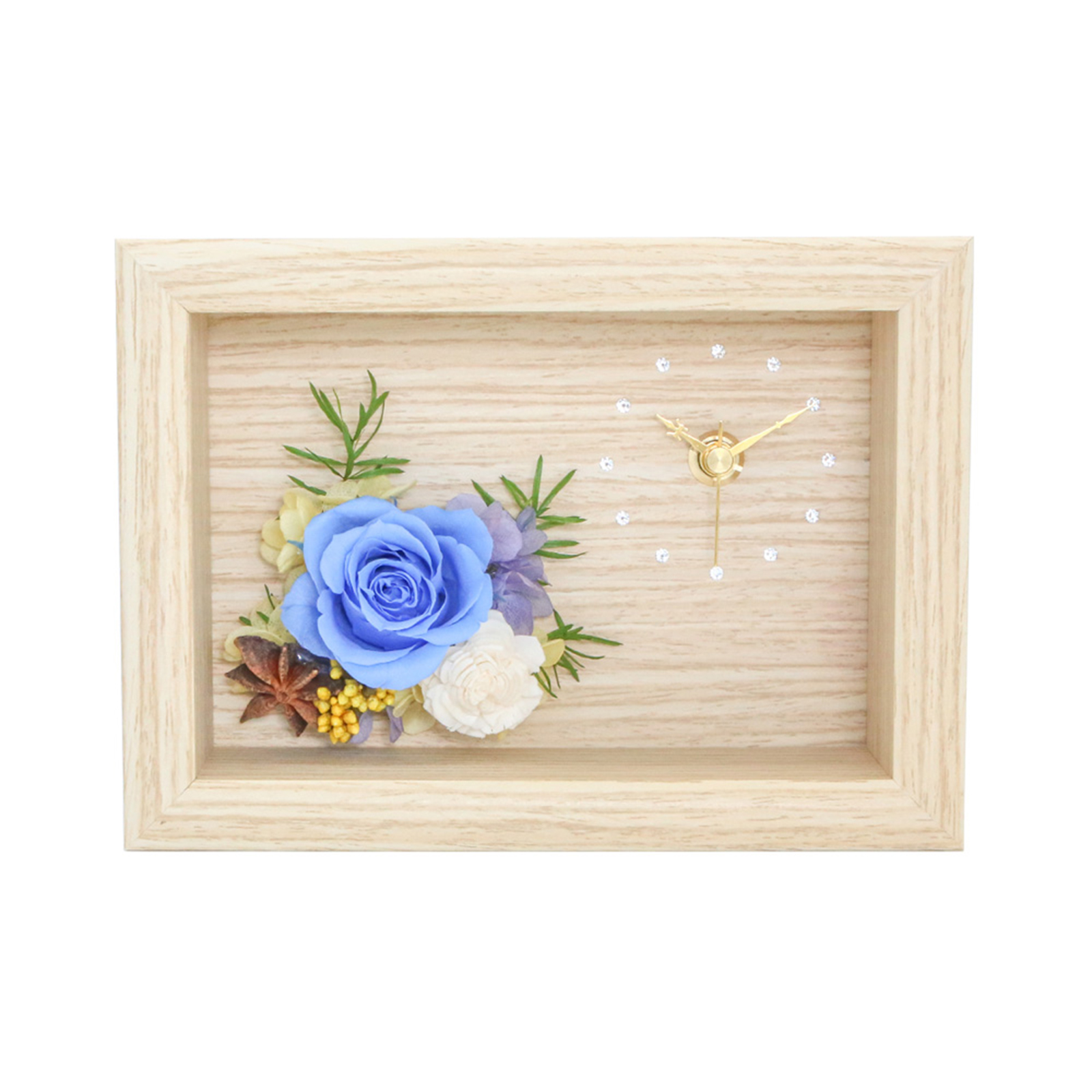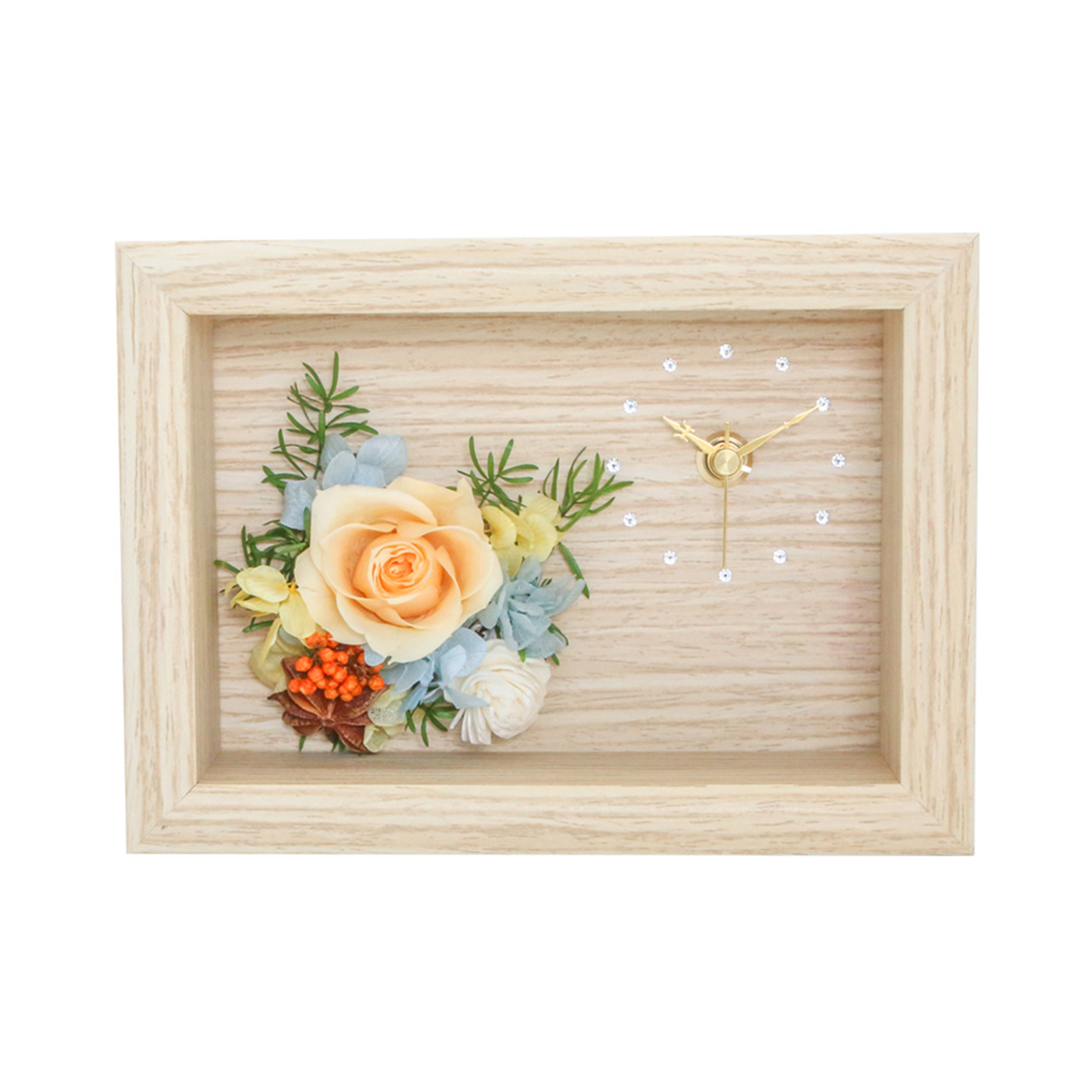 ナチュラルなウッド調フレームにハワイリゾートを感じる爽やかなアレンジメントを施したフラワークロックです。生花のようなみずみずしい質感をもつプリザーブドフラワーは水やり不要で綺麗な状態を永く楽しんでいただけます。夏におくるプレゼントや海外ウエディングギフトにおすすめです。