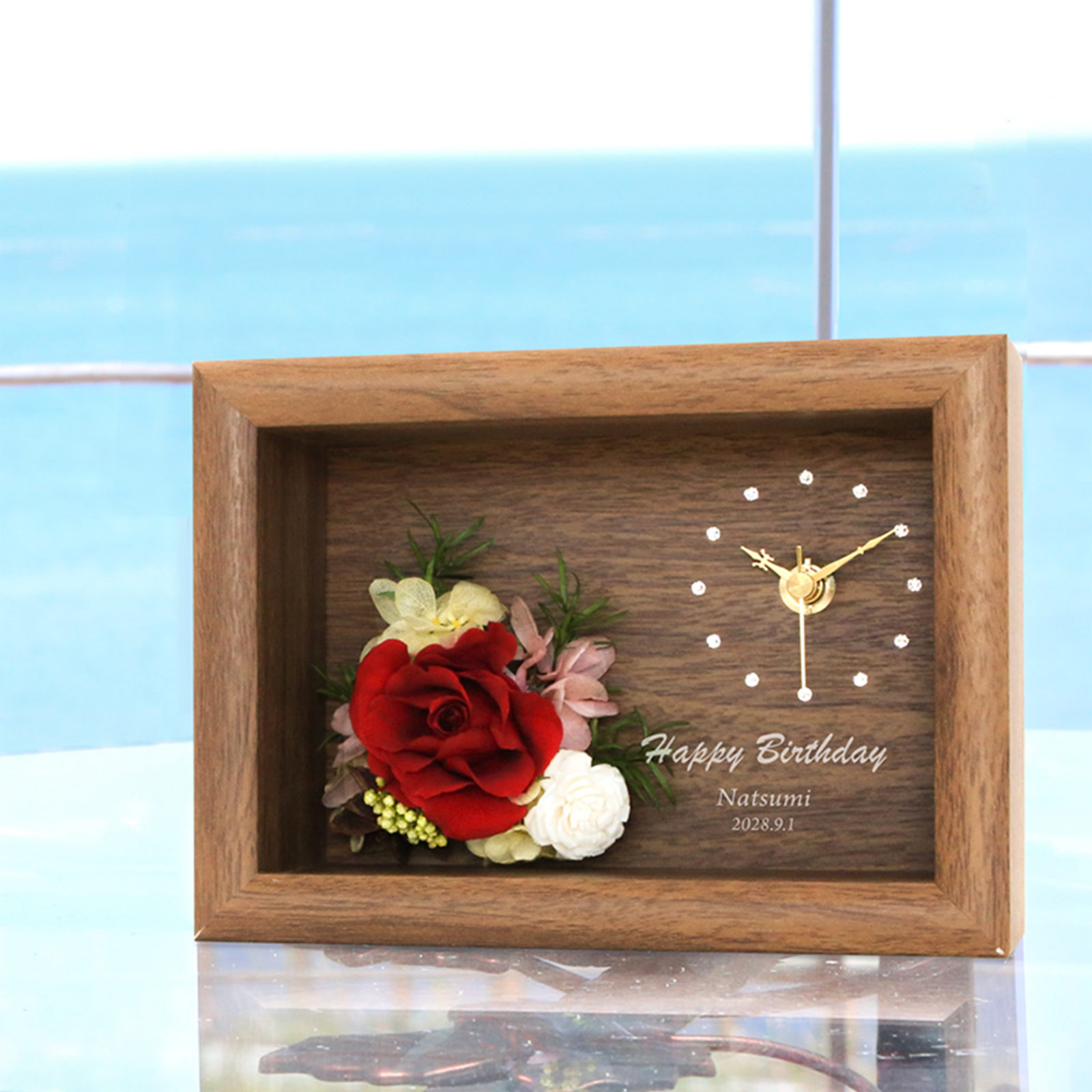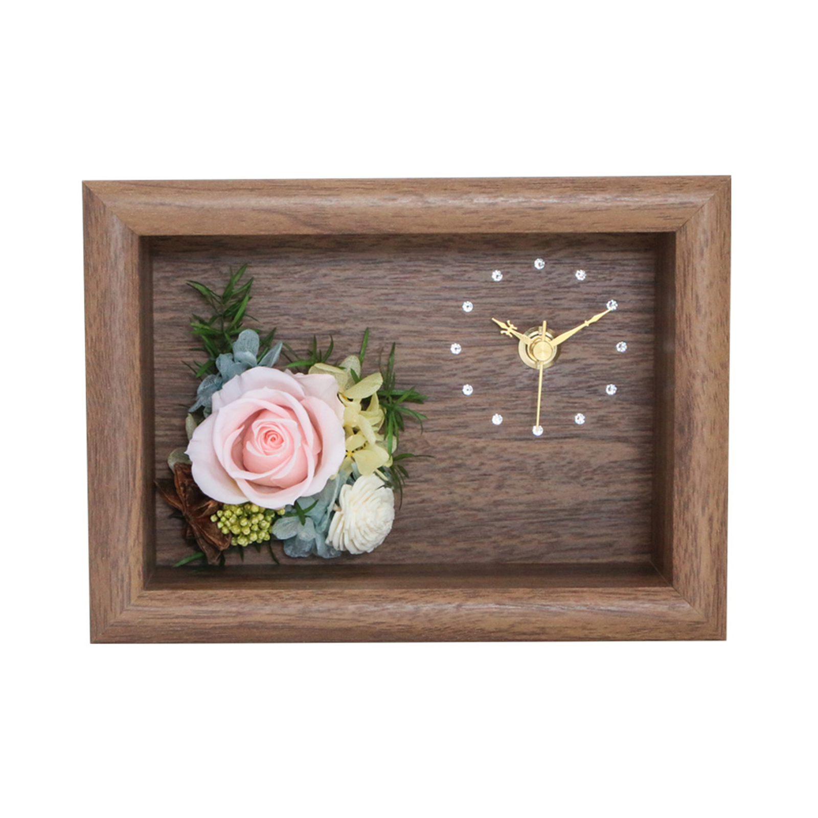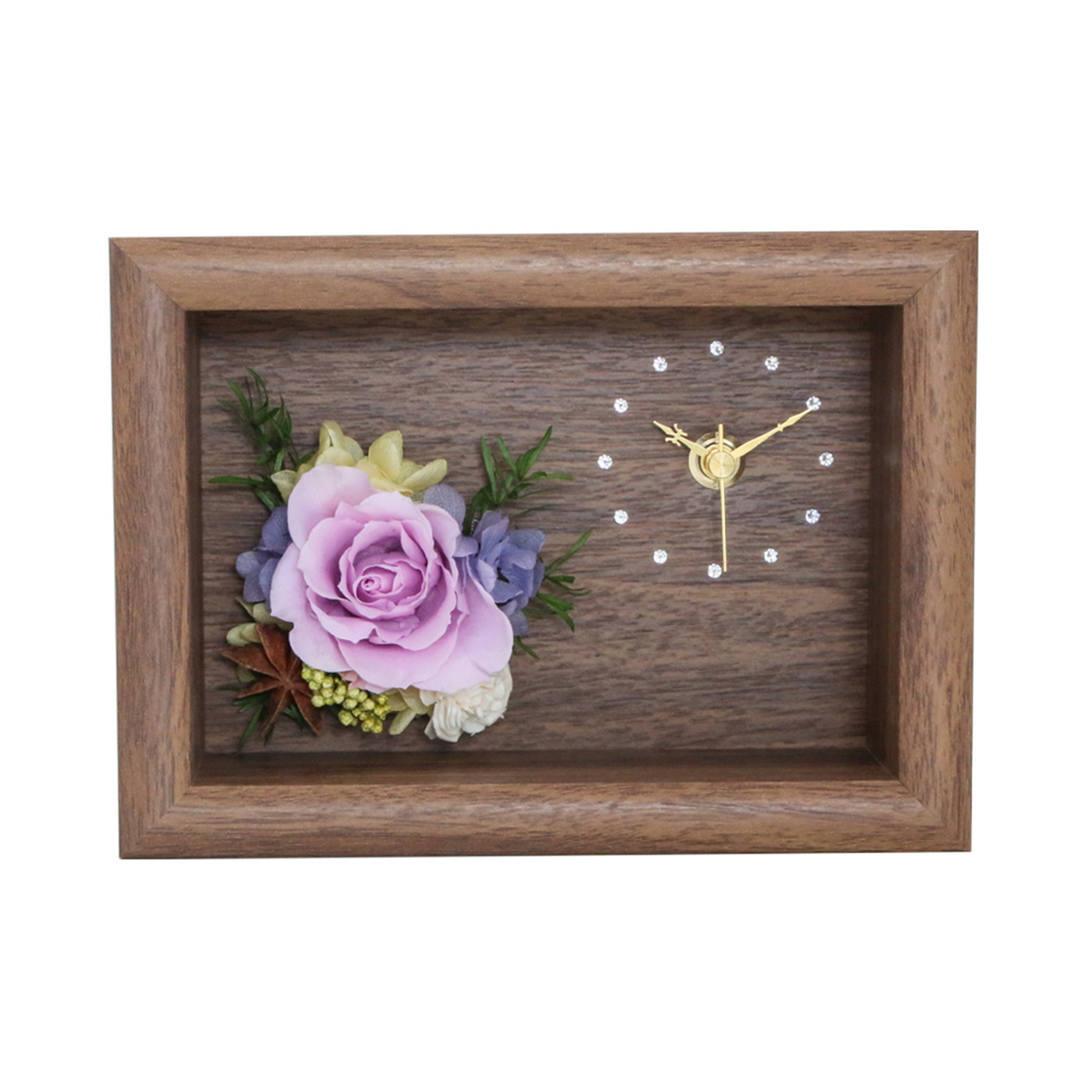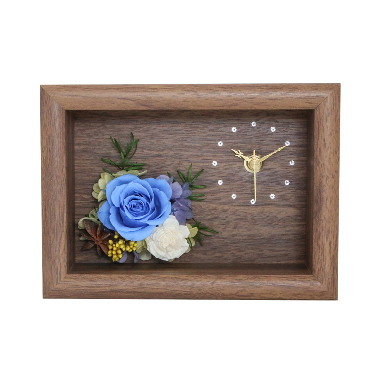 ナチュラルなウッド調フレームにハワイリゾートを感じる爽やかなアレンジメントを施したフラワークロックです。生花のようなみずみずしい質感をもつプリザーブドフラワーは水やり不要で綺麗な状態を永く楽しんでいただけます。夏におくるプレゼントや海外ウエディングギフトにおすすめです。
