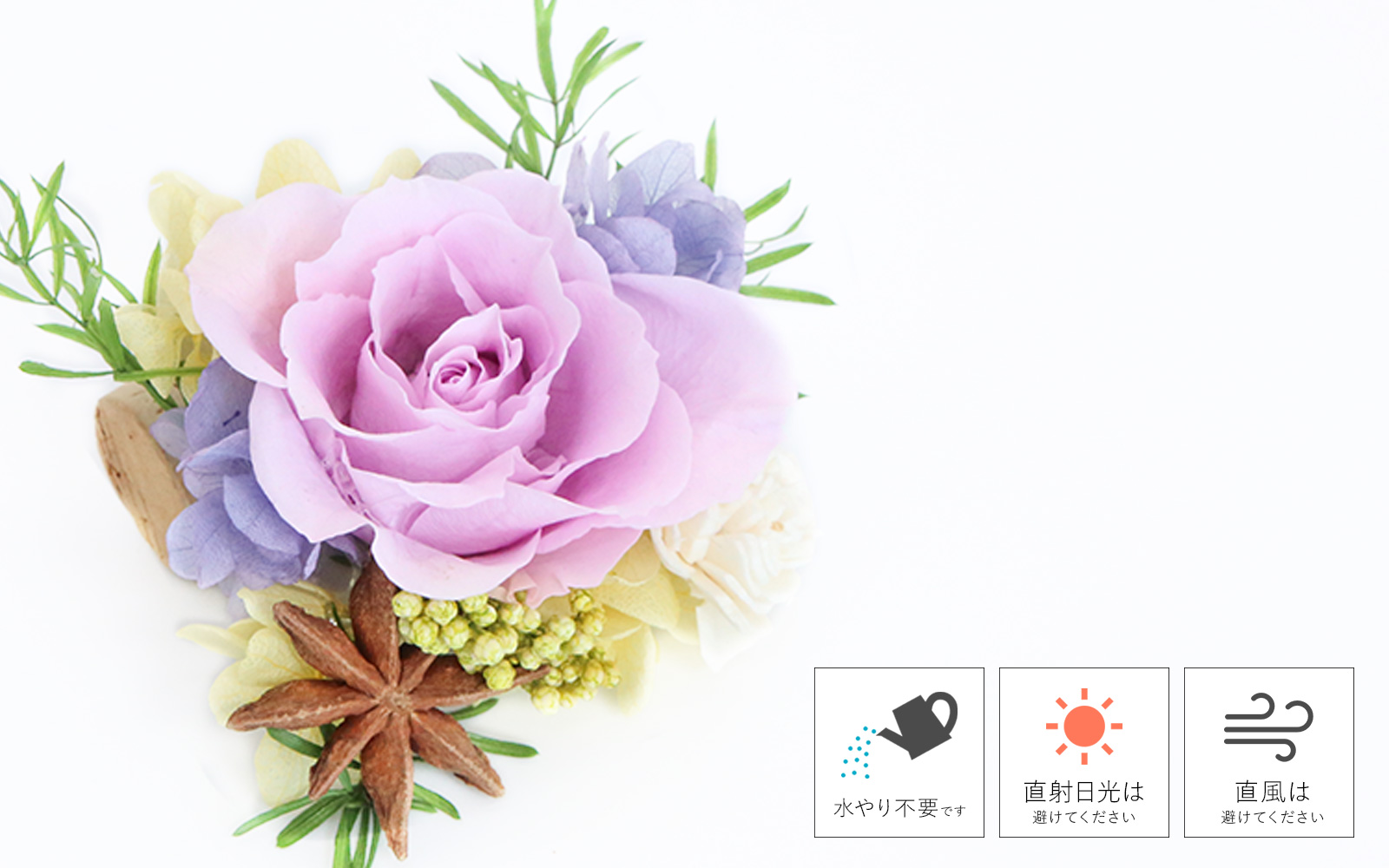 | ご使用上/安全上の注意 | ・ 自然の花を使っているため、時期によりお花の色味や開き具合が異なる場合がございます。 ・ご覧頂いている画面により、実物の色と異なって見える場合がございます。 ・より永く鮮やかさをお楽しみいただくくため、直射日光の当たる場所や高温・多湿の場所には放置しないでください。詳しくは同梱の『プリザーブドフラワーの楽しみ方』をご確認ください。 |