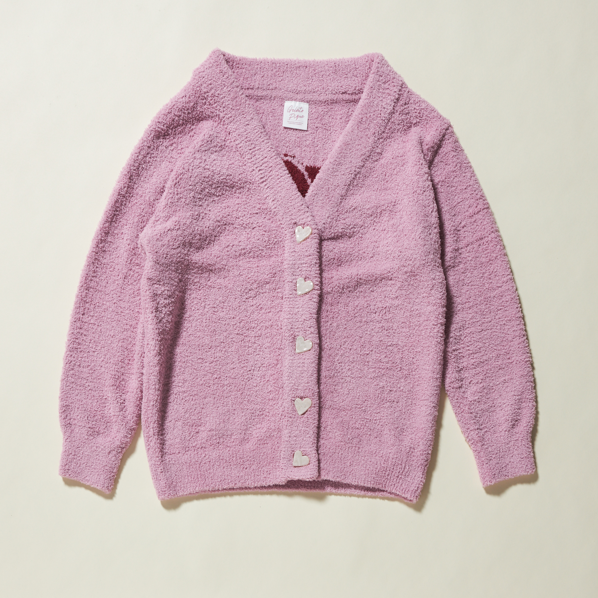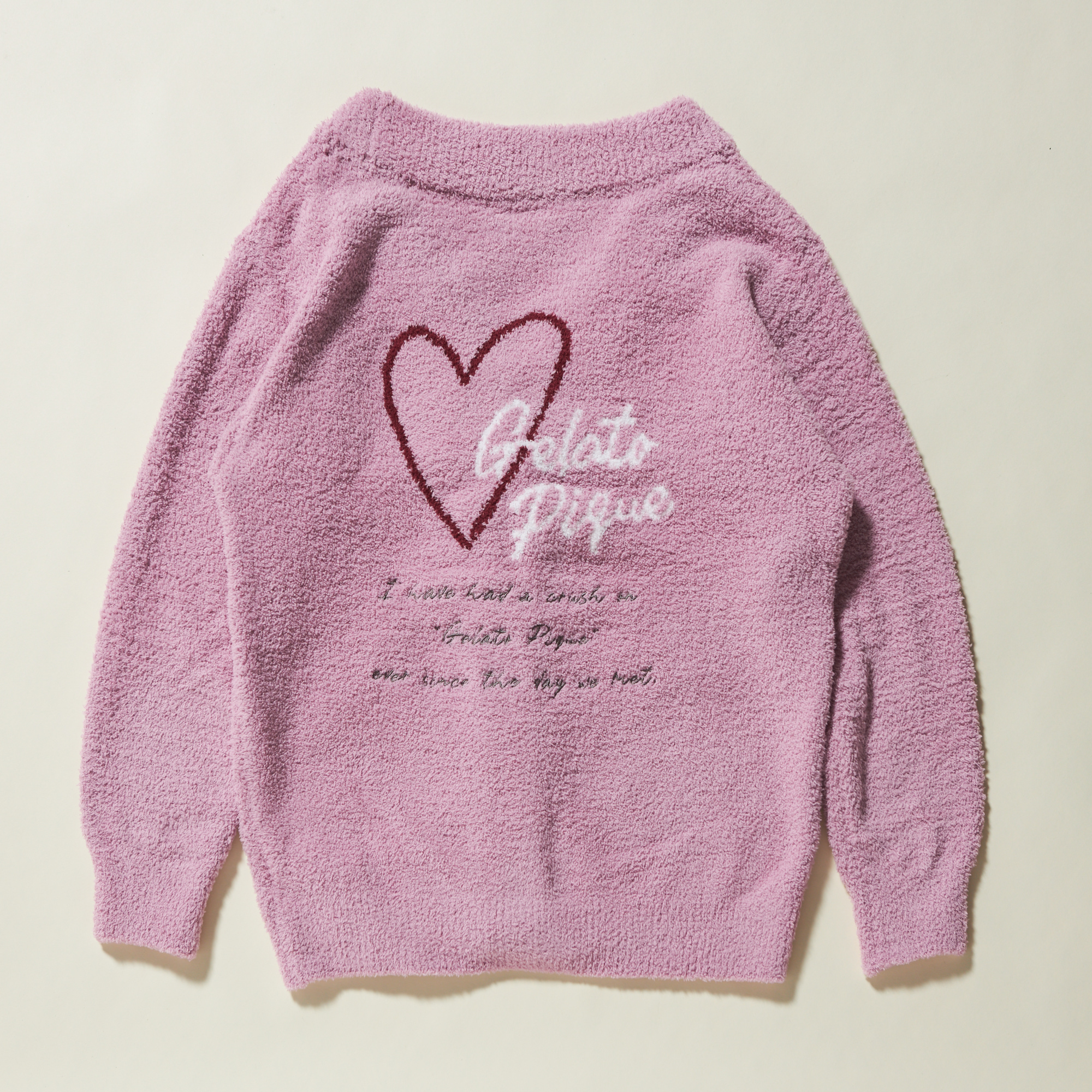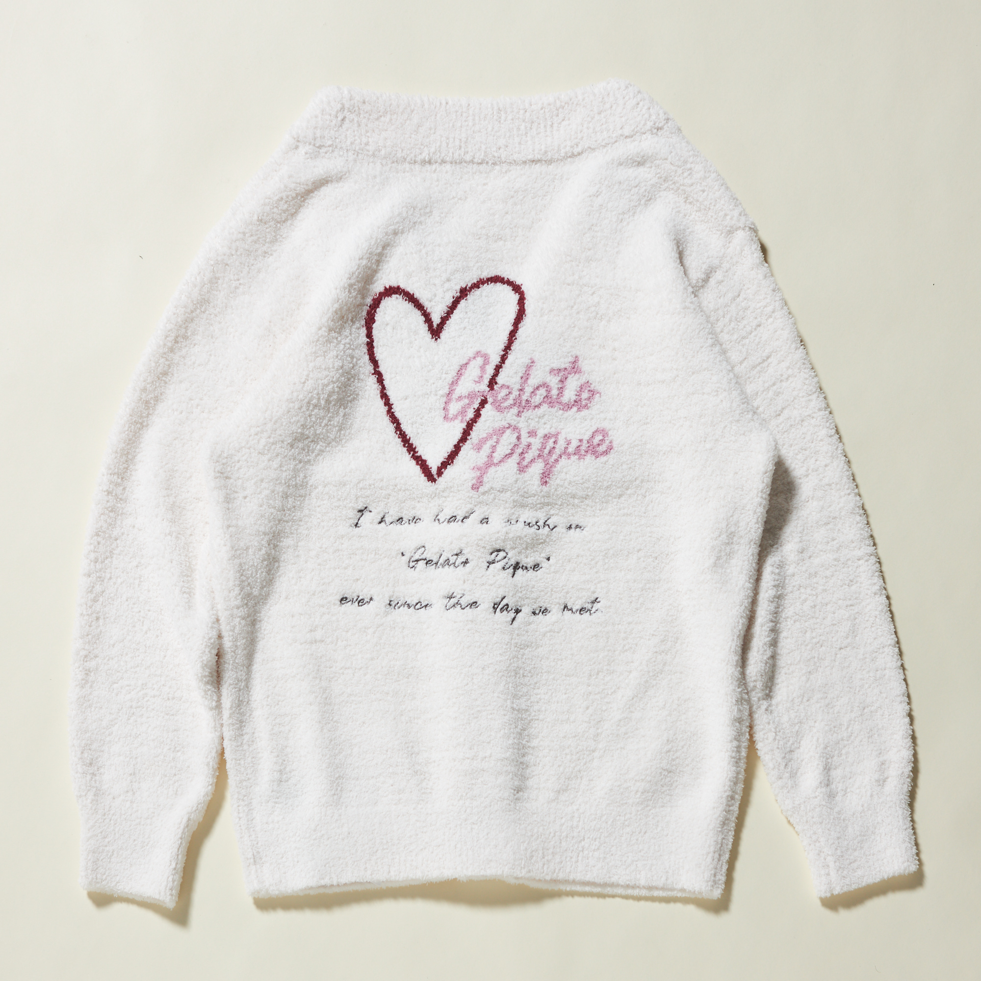 大口注文・法人のお問い合わせはこちらテーマは『初恋』。 "ルームウエアがジェラートピケに恋をした″というコンセプトの、初恋のようにピュアでスイートなコレクションです。春先までの肌寒い時期にぴったりなパウダー素材に、ハート型のボタンをあしらったカーディガンです。フロントはシンプルですが、背中には大きなハートジャガードとメッセージ刺繍を大胆に入れたデザイン。色はピュアなオフホワイトとこっくりしたピンクの2色をご用意しました。