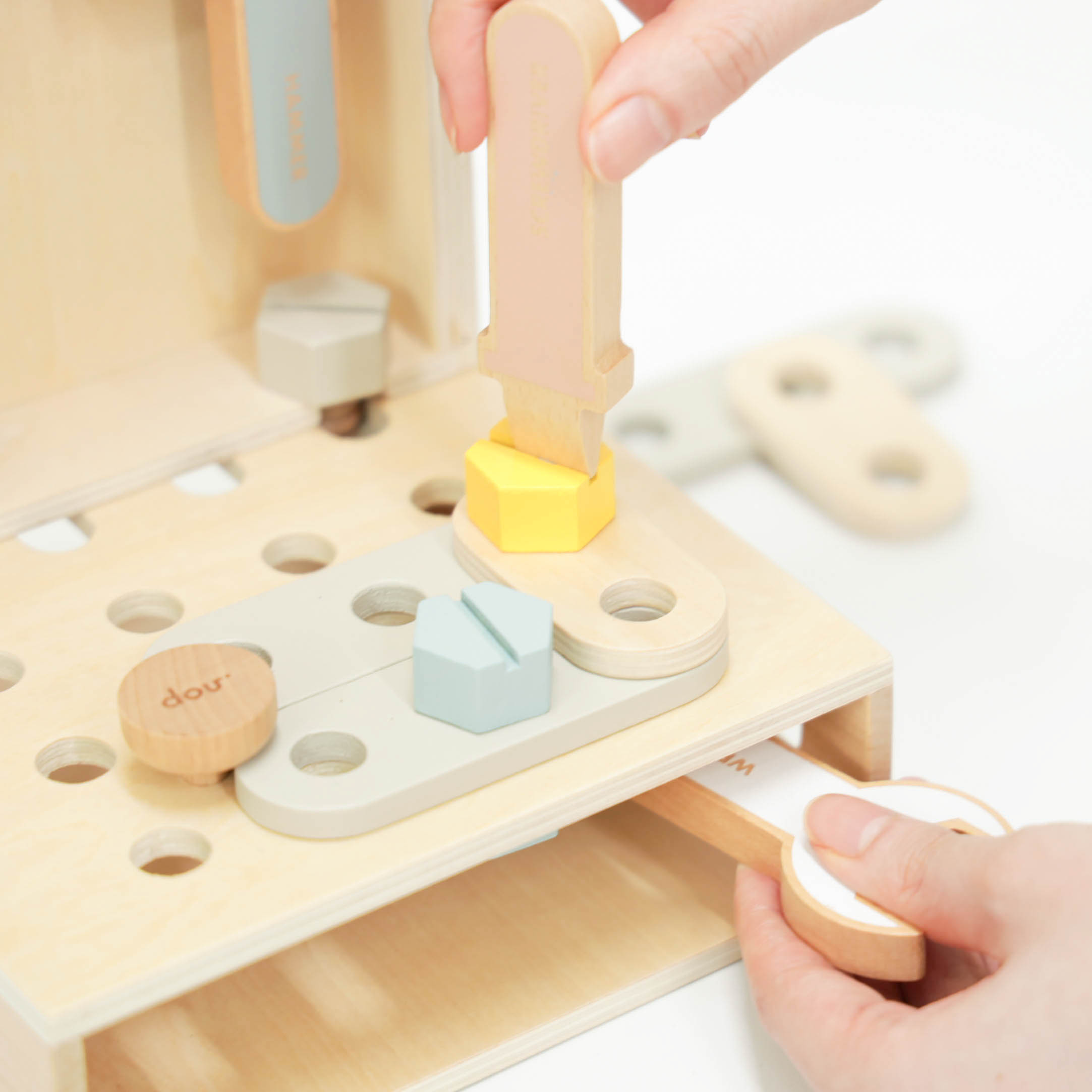 引き出し部分はツール収納に変身し、子供たちはボルトやナットを使ってオリジナル作品を作ることができます。 収納は簡単で、持ち運びにも便利です。お片づけの習慣を身につけさせると同時に、想像力や創造力、コミュニケーション能力を育むおもちゃとして最適です。