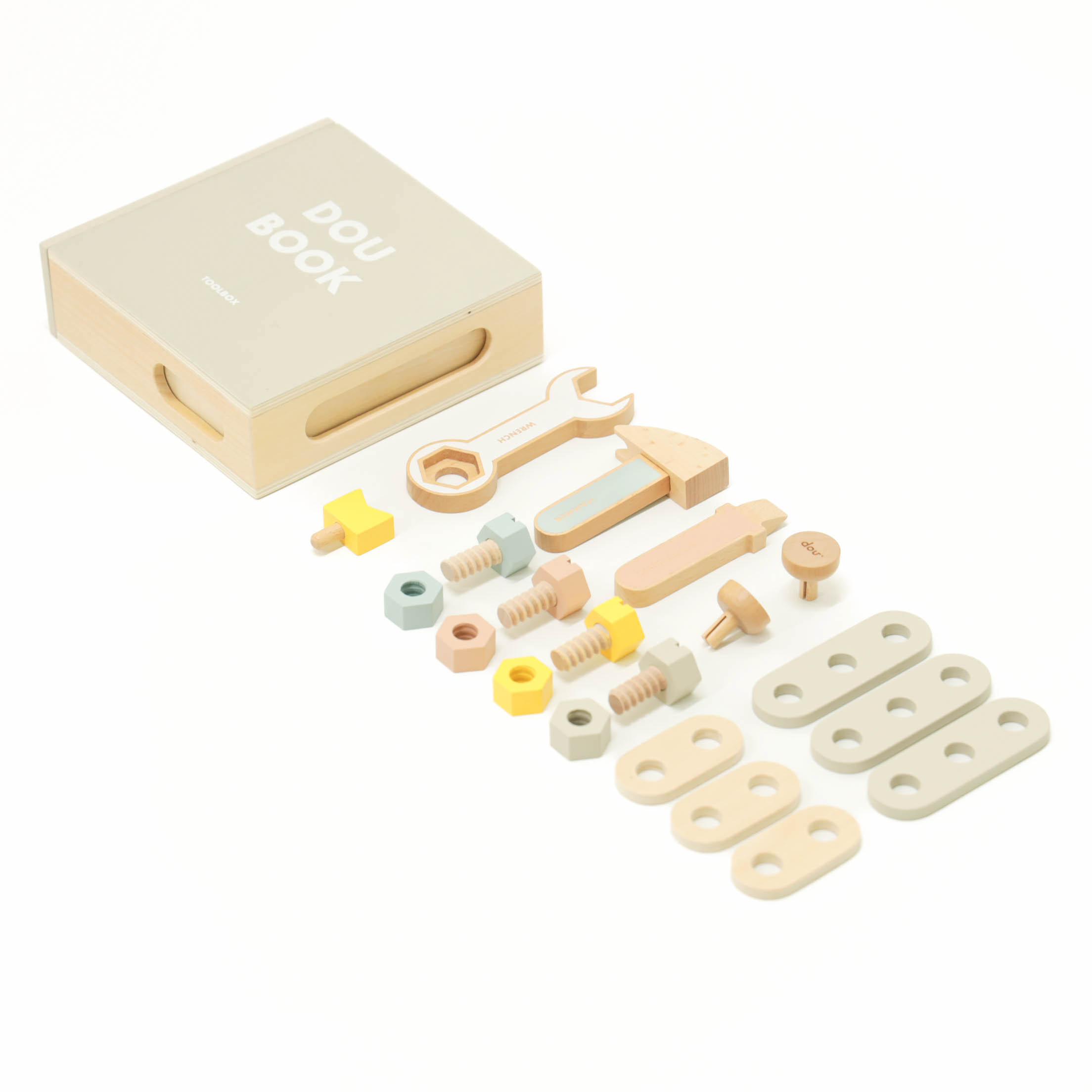 ちいさな本の形のBOXにおもちゃが入った” DOU BOOK “シリーズ 。「学びと遊ぶ」をBOXにそれぞれつめこみました。ハンマーやレンチ、マイナスドライバー、ボルト、ピンなど充実の内容物がセットになっています。子供たちの想像力を豊かにし、手先の発達も促進する最適なおもちゃです。
