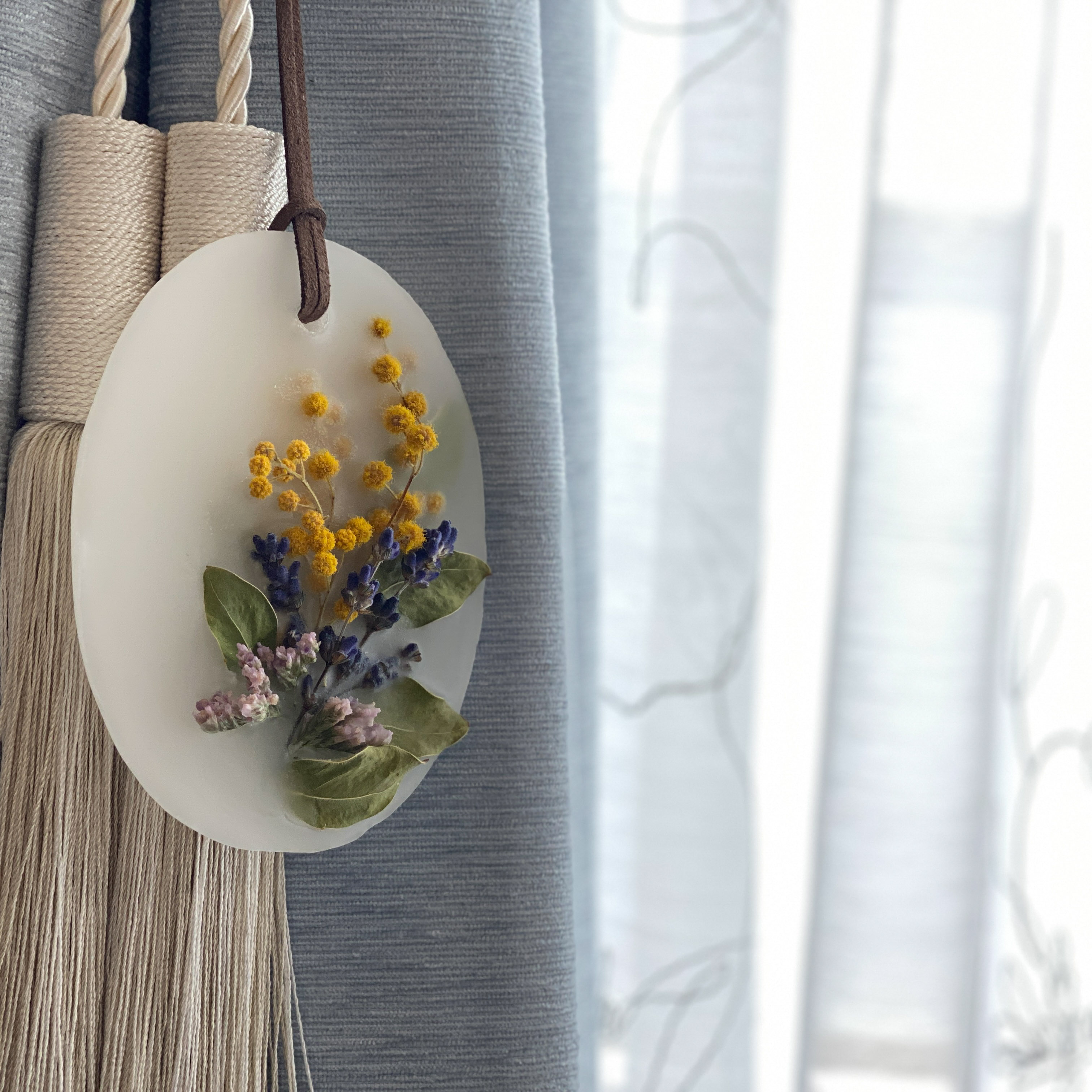 鮮やかなミモザとラベンダーのドライフラワーをアロマワックスの中に詰め込みました。鮮やかな色合いでインテリアにもぴったりです。角をとった丸みのあるデザインで手のひらに乗るサイズ感がとても愛らしいです。