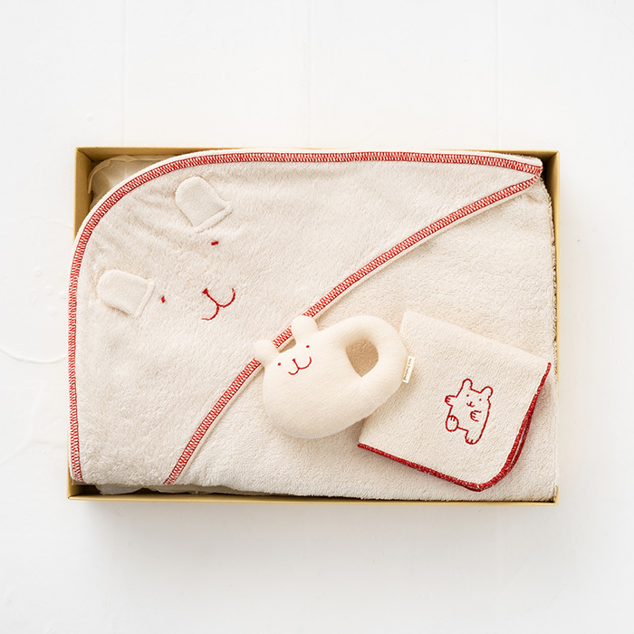 大口注文・法人のお問い合わせはこちら長くご愛用いただける帽子付きアフガン、タオルハンカチ、ガラガラ。オーガニックコットンを使用したギフトセットです。 かわいい癒される表情のキャラクターのセットです。お肌にやさしい素材オーガニックコットンを使用しています。