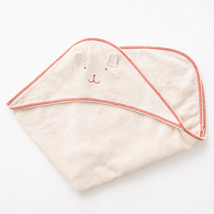 両面パイルで吸水性の良いやわらかな肌触りのアフガン。 三角フードを赤ちゃんにかぶせてあげれば、耳がピョンと 立って、かわいらしさが際立ちます。 水遊びの後、お風呂上がり、ねんねの時などいろいろ使えます。