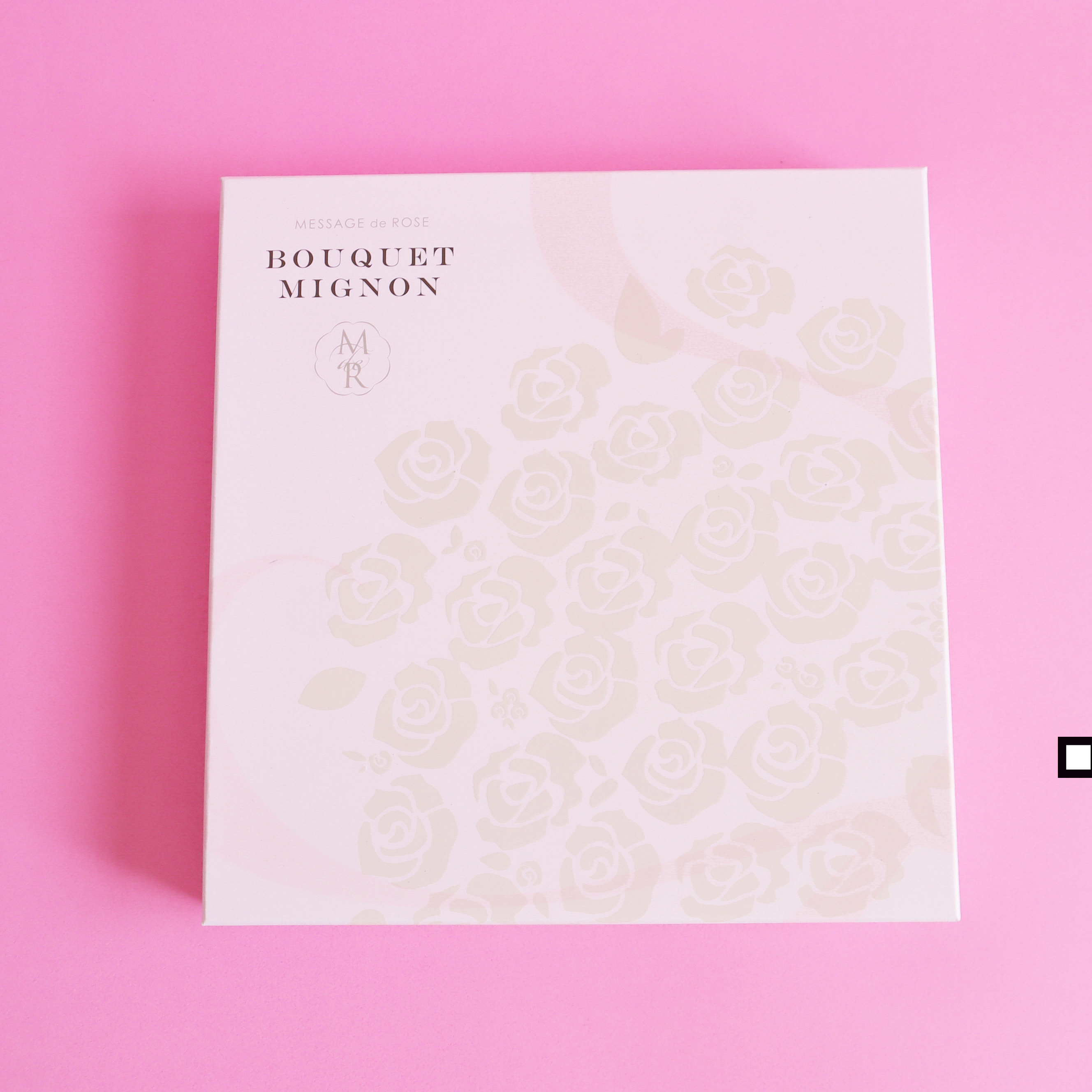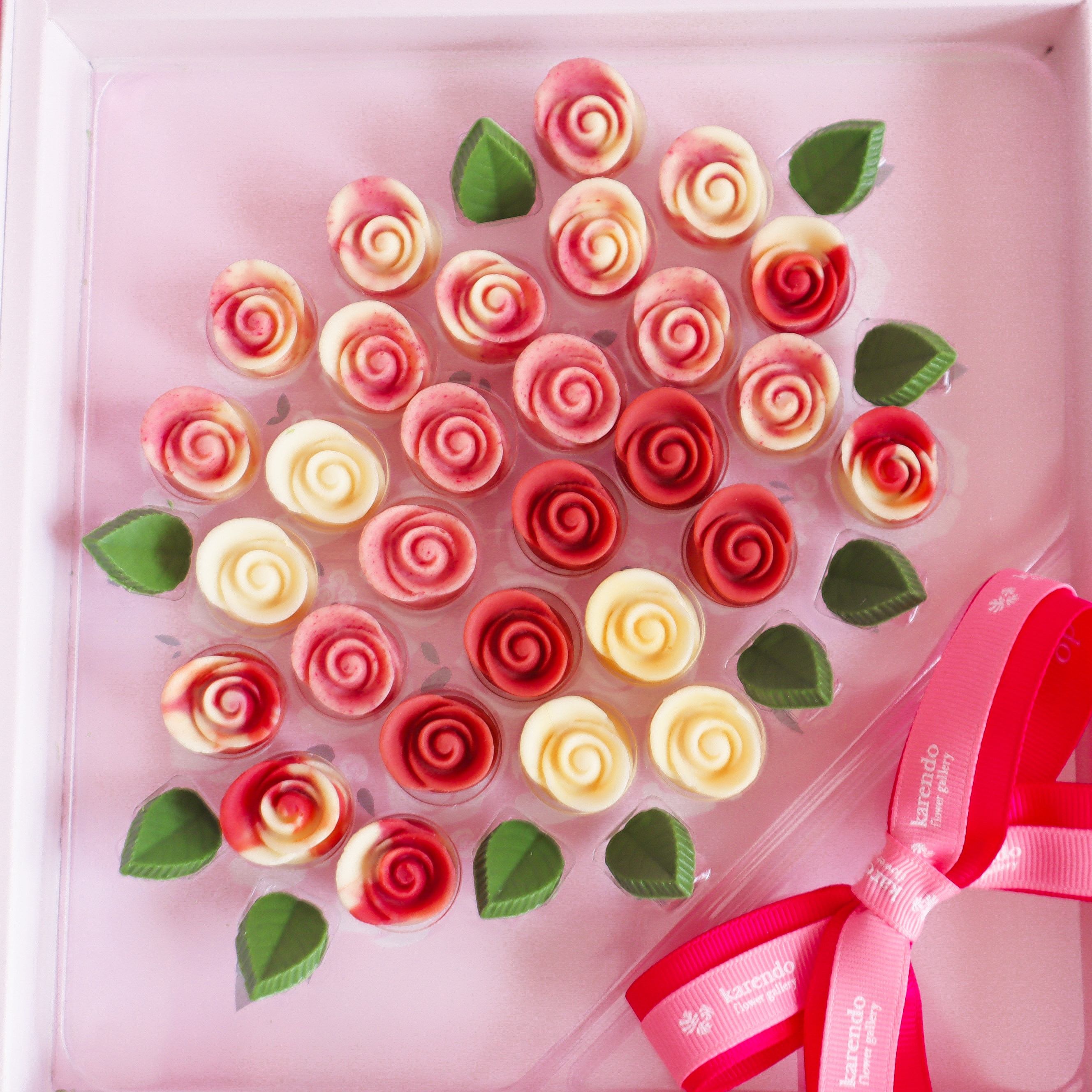 可憐な白のボックスの中にラズベリー、ストロベリー、レモン、ホワイト、ストロベリーホワイト、ラズベリーホワイト、抹茶の7種の薔薇のつぼみで模ったブーケ。 合成着色料、保存料を使用せずシェフが甘みと苦みのバランスを考え、芳醇な味わいに仕上げたオリジナルブレンドのチョコレートを使い、まるで花びらのような繊細な口当たりとやわらかな味わいのチョコレートに仕上げました。
