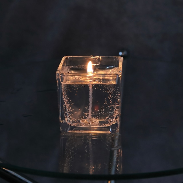 大口注文・法人のお問い合わせはこちら小ぶりなガラス容器に入った透明なキャンドルです。 柔らかい炎が、透明なジェルワックスと中の気泡を照らして、空間を神秘的な雰囲気に包み込みます。