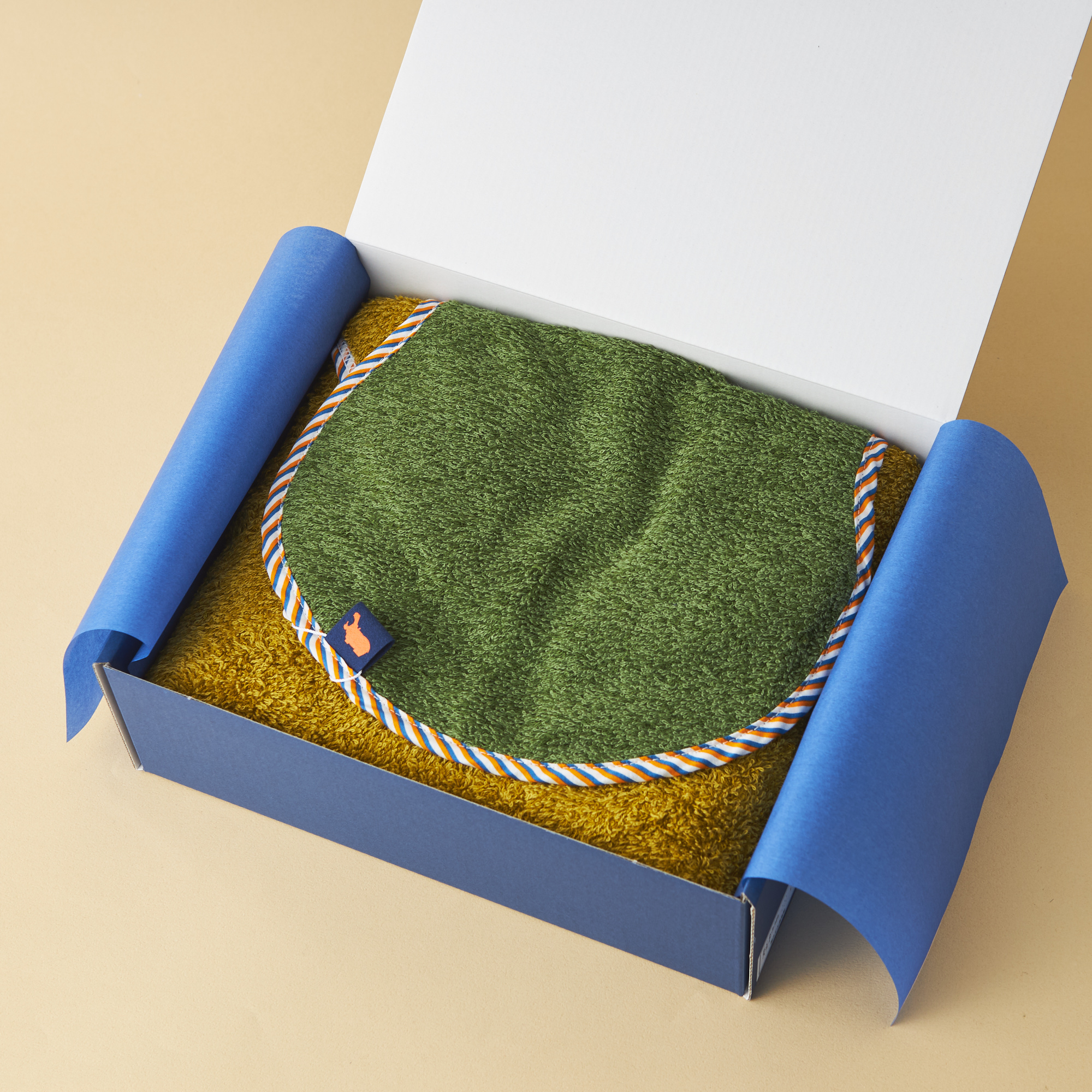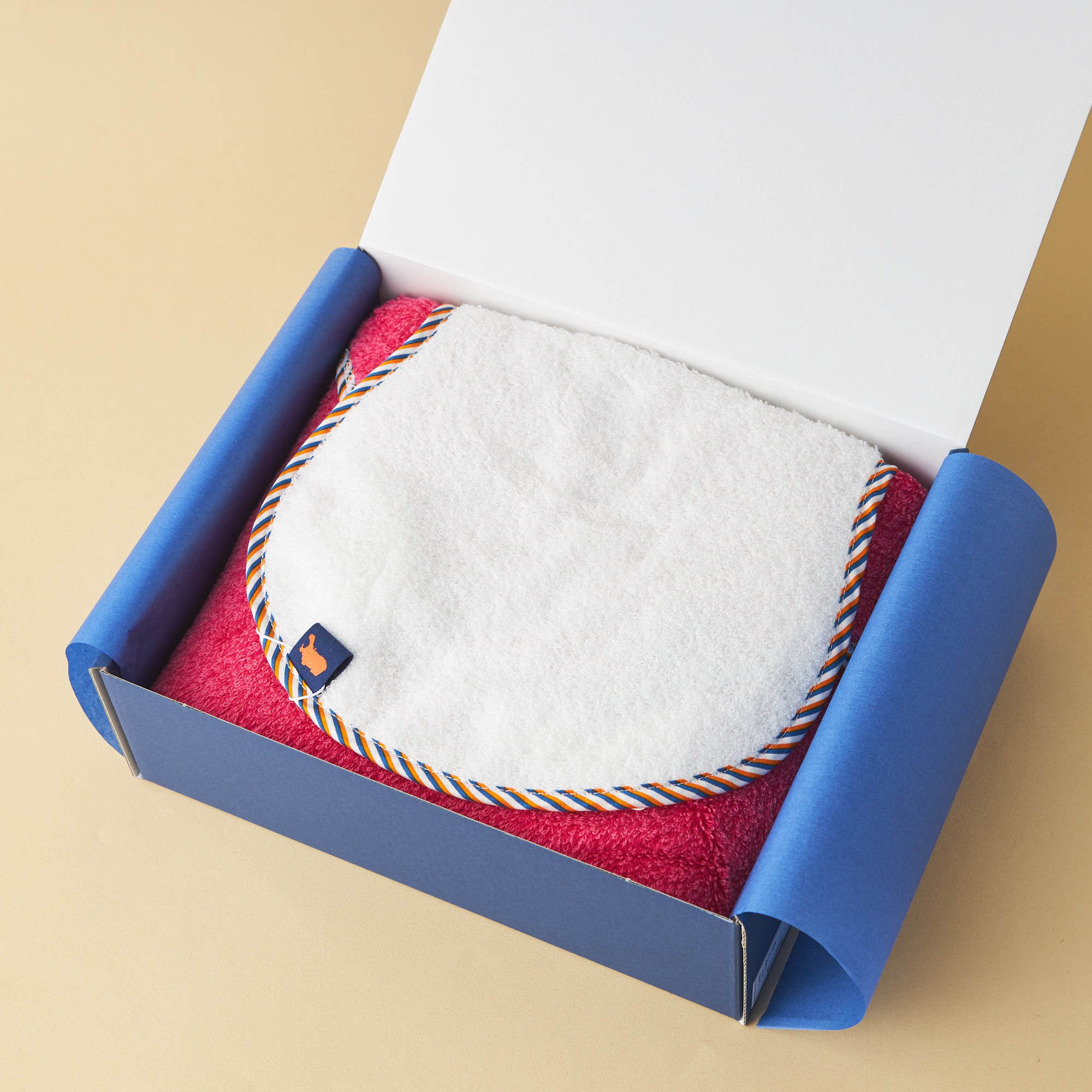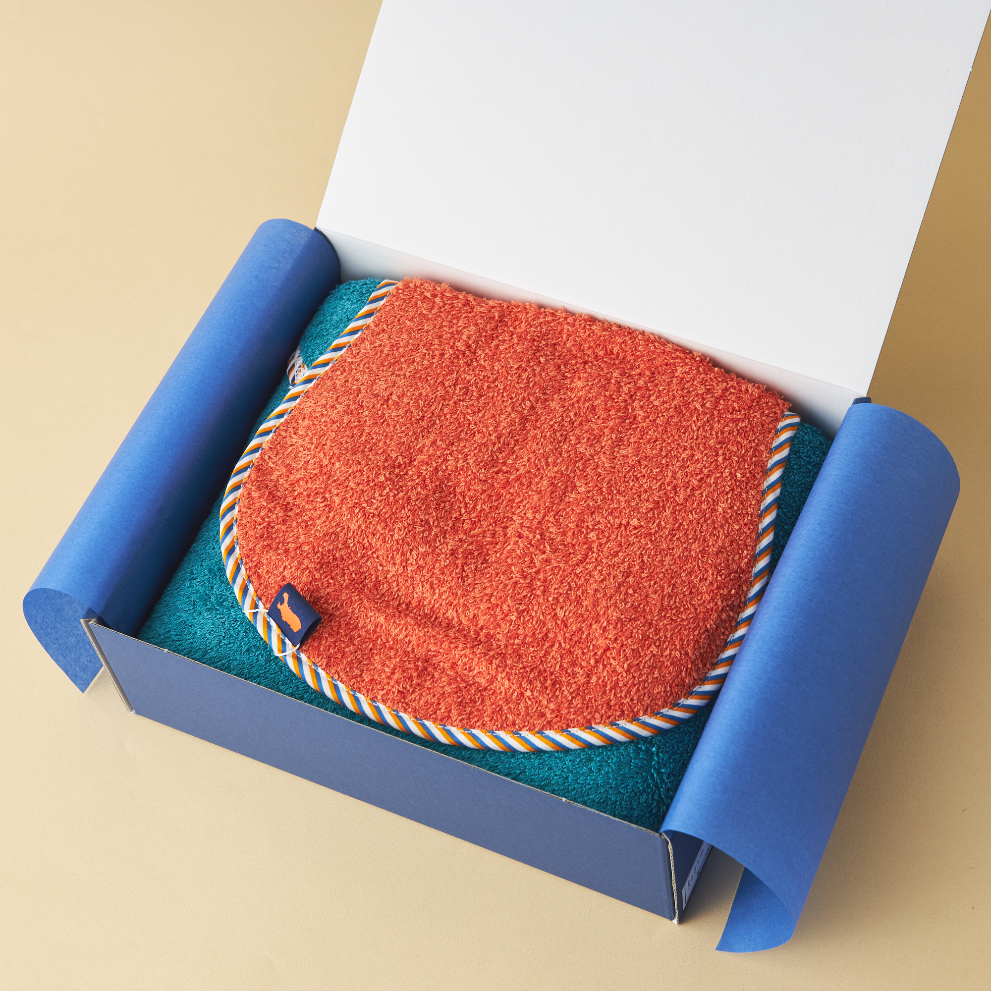 オーガニックコットンとバンブーレーヨン(再生竹繊維)を交織したヒポポタマス定番のタオル生地を使用。 縁取りにはエアメールを連想させるデザインでギフトにもぴったりです。 吸水性、肌触り、色鮮やかさと全てにこだわりがつまっています。 おくるみとしてだけでなく、沐浴後のバスタオルとしても使用できます。 フード付きで頭からすっぽりと被せ、湯上りの赤ちゃんを冷やさずに優しく包み込みます。 プールや海などでもサッと羽織らせて日差の対策など1枚あれば幅広く活躍してくれるアイテム。