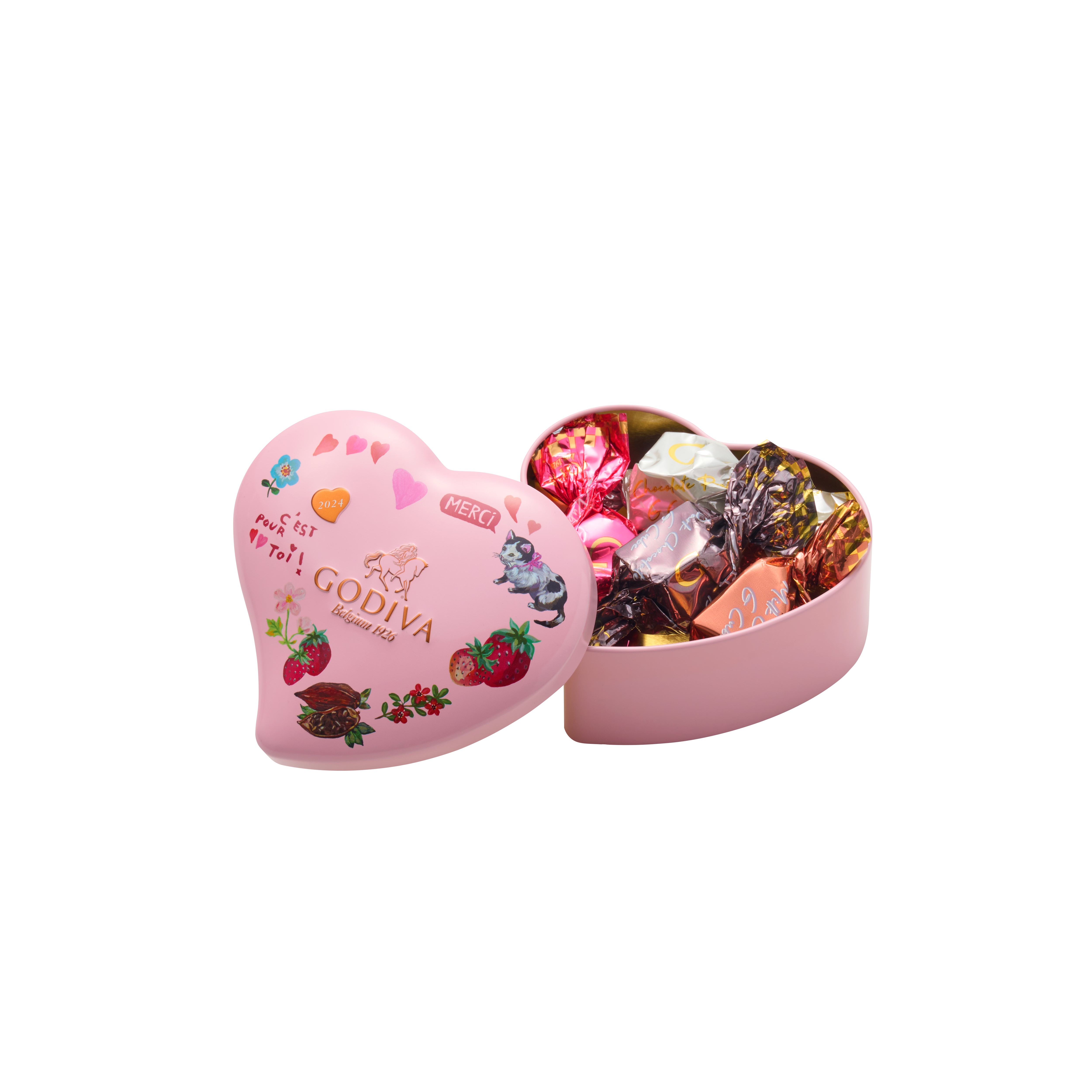 フレーバーをイメージしたフルーツなどをあしらったピンク色のハート缶に、ルビー、ホワイト、ミルク、ダークの4種類のG キューブ チョコレートを詰め合わせました。