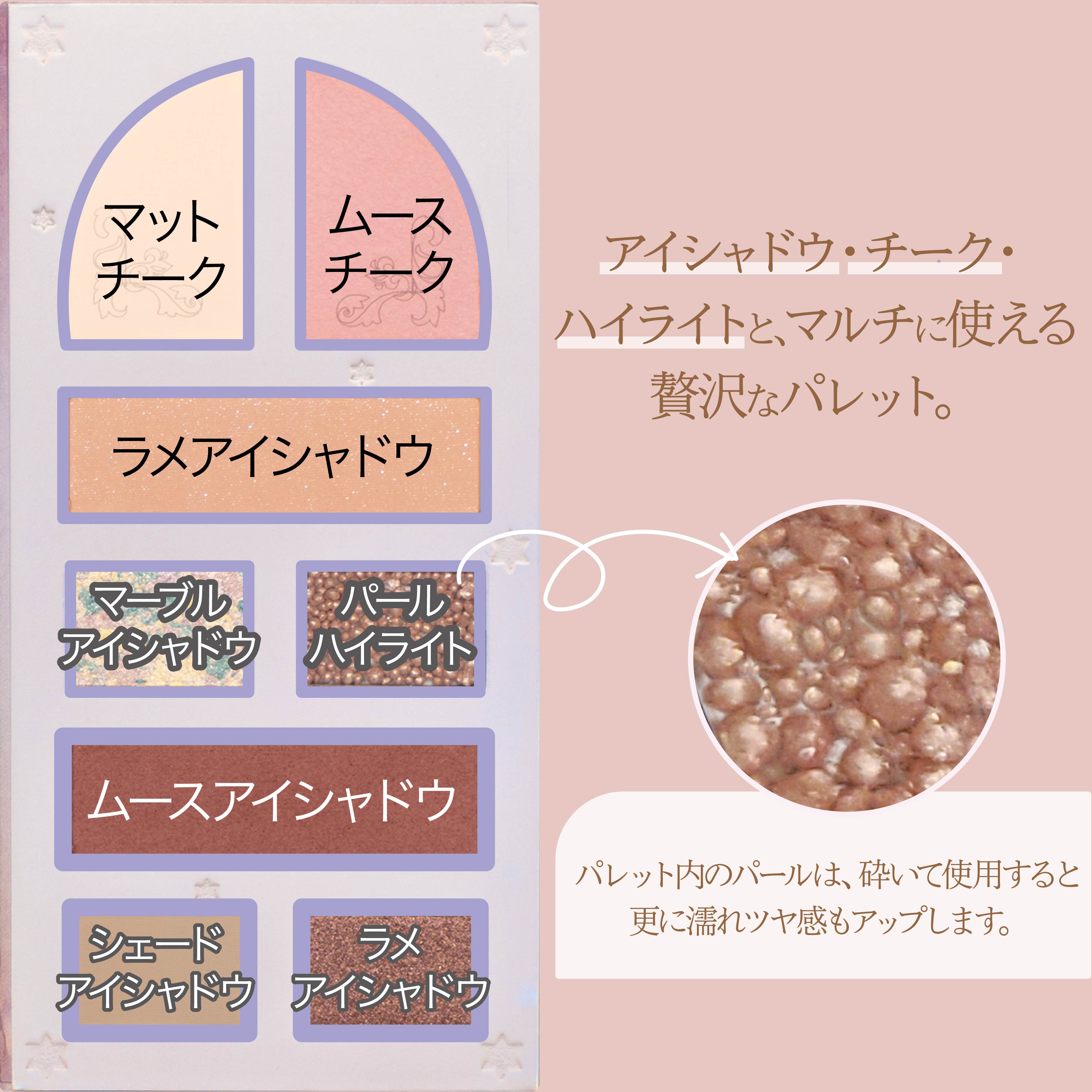 鮮やかな色の花を咲かせ、「虹の花」とも呼ばれるアイリス。 「アヤメ」の儚さを落とし込んだ、様々なピンクカラーが乙女心をくすぐる配色です。 多色ラメのマーブルアイシャドウがピンクの可愛さをさらに引き出してくれることで、1パターンに収まらないピンクメイクを楽しめます。