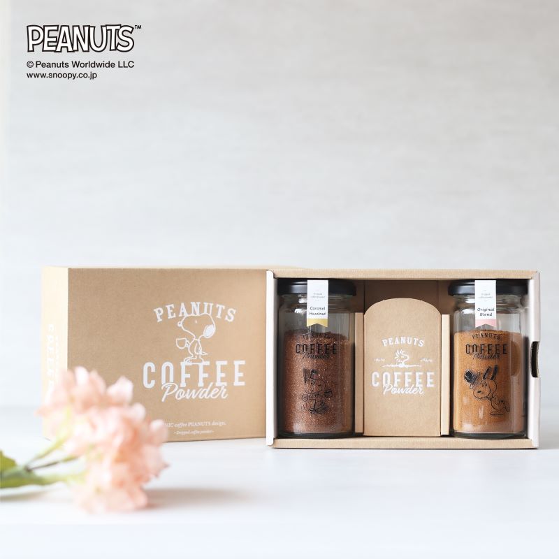 大口注文・法人のお問い合わせはこちら大人気の瓶タイプ商品がセットになったギフトセットです。 オリジナルブレンド、キャラメルヘーゼルナッツの味わいをご堪能いただけます。 瓶にはスヌーピーが描かれており、インテリアとしても楽しめます。