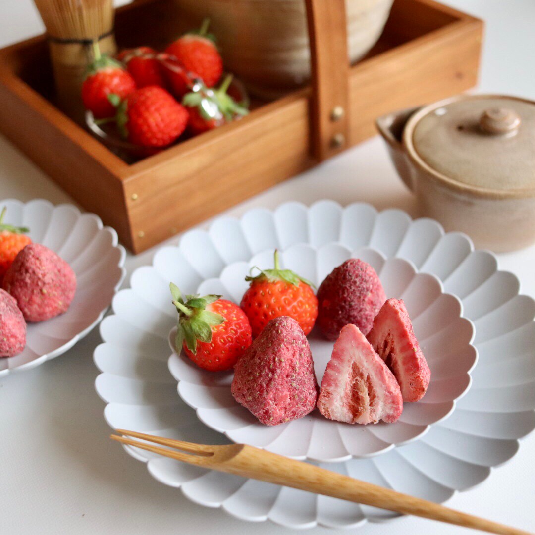 果実の水分を飛ばし、水分が抜けたところへ、独自に開発したホワイトチョコレートを果実の中までしっかりと浸透させて作っています。 苺の繊維の中までたっぷりと浸み込ませることで、丸ごと苺がチョコレートの味わいに変身!素材の良さを凝縮してできた、新感覚スイーツをお楽しみください。