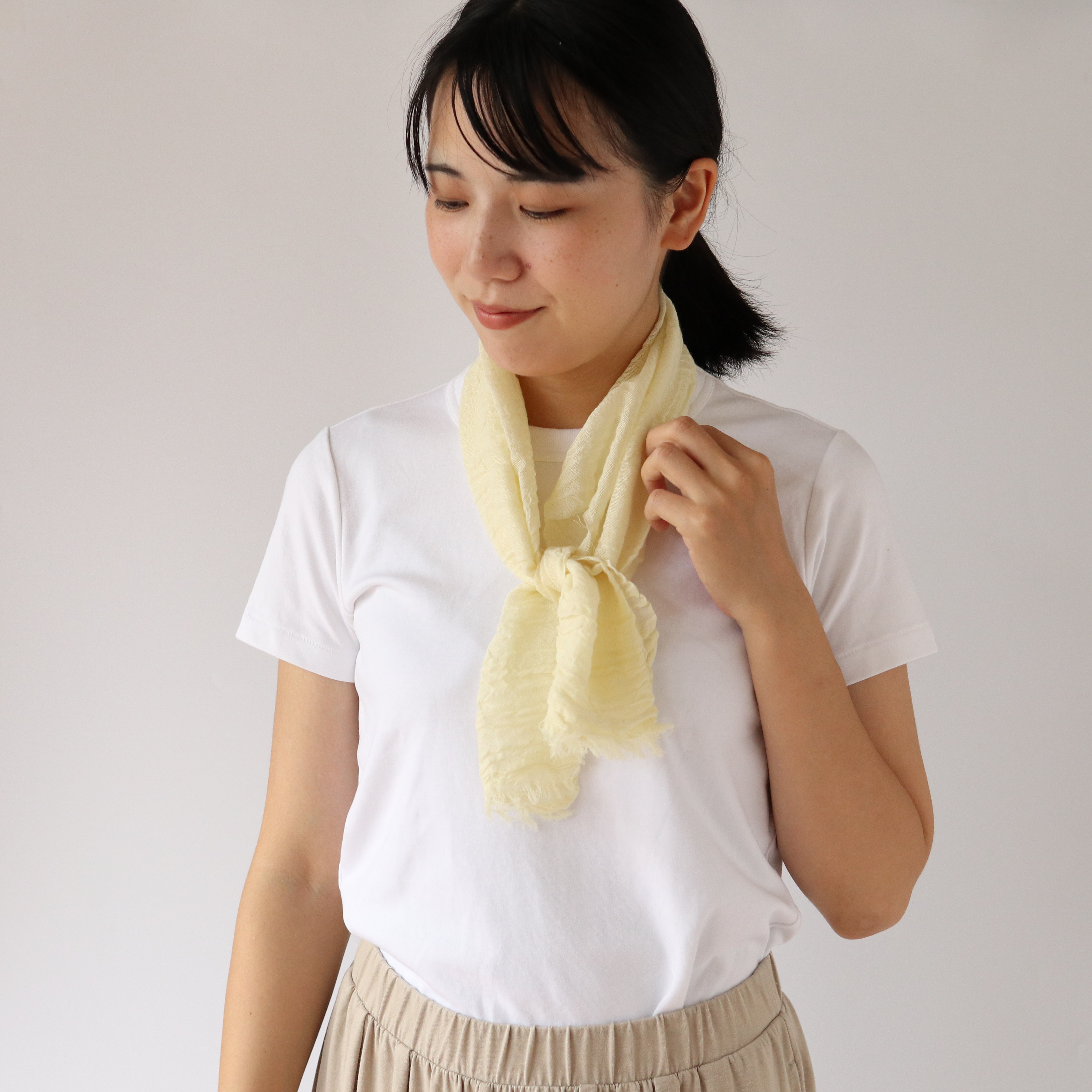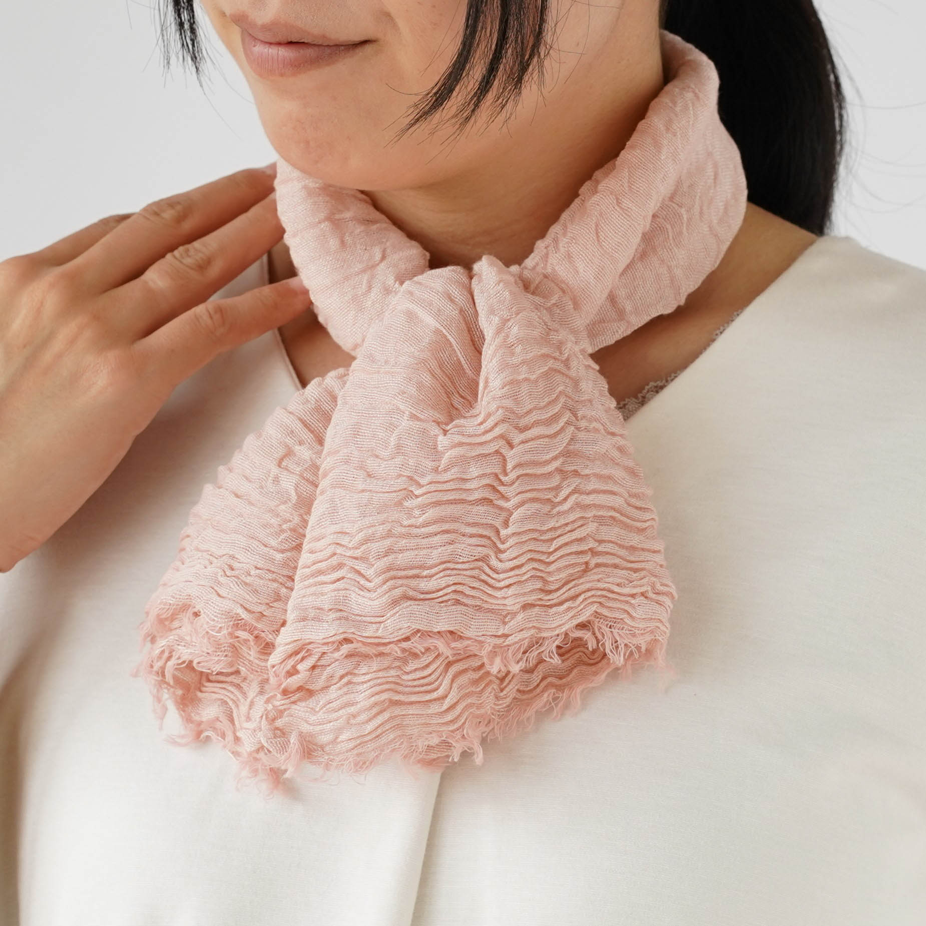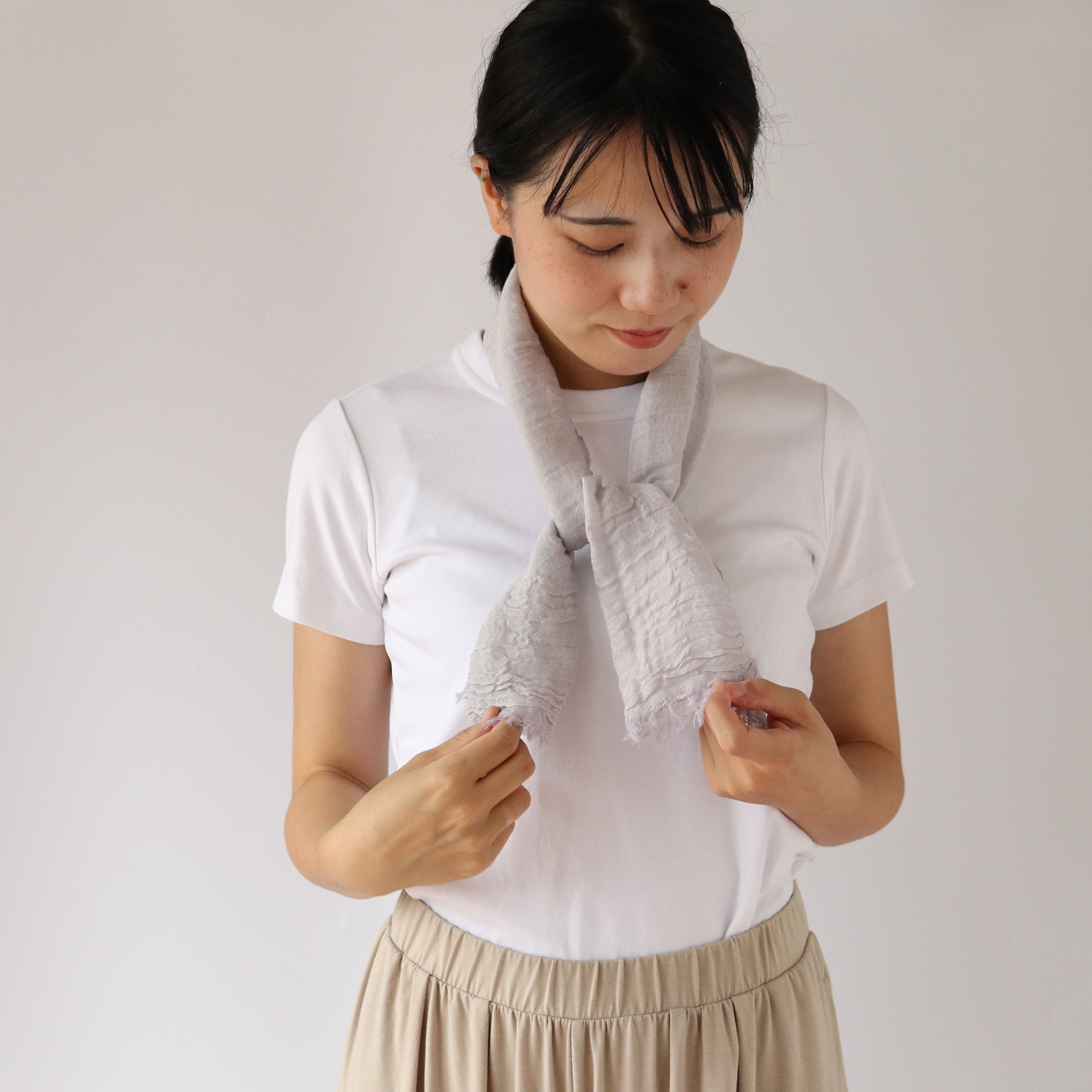 紫外線カット率97%のシルクと綿のストールで、さっと巻くだけで紫外線対策。吸水速乾性能で汗をかいても快適。 3色展開でファッションにも馴染み、顔周りを明るく見せます。くしゅくしゅのシボ感で持ち運びにも便利です。