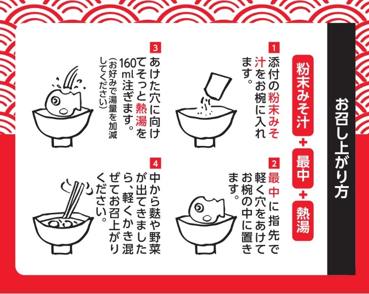 | 原材料 | ◆海苔茶漬け◆ もち米(国産)、食塩、あられ、ぶどう糖、のり、でん粉、砂糖、昆布粉末/調味料(アミノ酸等) ◆赤みそ汁◆ みそ汁の素:FD粉末豆みそ(大豆、食塩)、鰹節粉末、食塩、砂糖、酵母エキス、デキストリン、昆布粉末 具:もち米粉(国産)、焼麩(小麦粉、小麦グルテン)、ほうれん草、水あめ、食塩/着色料(紅麹)、黄4,黄5、赤3、赤102、赤106、青1、青2 ◆白みそ汁◆ みそ汁の素:FD粉末米みそ(大豆、米、食塩)、鰹節粉末、食塩、砂糖、酵母エキス、デキストリン、昆布粉末 具:もち米粉(国産)、焼麩(小麦粉、小麦グルテン)、ほうれん草、水あめ、食塩/着色料(紅麹) ◆お吸物◆ 吸物の素:食塩、ぶどう糖、かつお節粉末、粉末醤油、こんぶ粉末、たん白加水分解物/調味料(アミノ酸等)、カラメル色素、(一部に小麦・大豆を含む) 具:もち米粉(国産)、焼麩(小麦粉、小麦グルテン)、ほうれん草、水あめ、食塩/着色料(紅麹) ◆梅茶漬け◆ もち米粉(国産)、食塩、梅加工品(梅肉、食塩、乳糖、小麦粉、ぶどう糖)、あられ、ぶどう糖、でん粉、砂糖、のり、昆布粉末、抹茶、鰹節粉末/調味料(アミノ酸等)、酸味料、着色料(ベニコウジ、黄4、黄5、赤3、赤102、赤106、青1、青2) ◆たらこ茶漬け◆ もち米粉(国産)、食塩、乾燥調味たらこ(たらこ、食塩、乳糖、その他)、あられ、ぶどう糖、でん粉、砂糖、のり、昆布粉末、抹茶、鰹節粉末/調味料(アミノ酸等)、酸味料、着色料(ベニコウジ)、酸化防止剤(ビタミンE) |