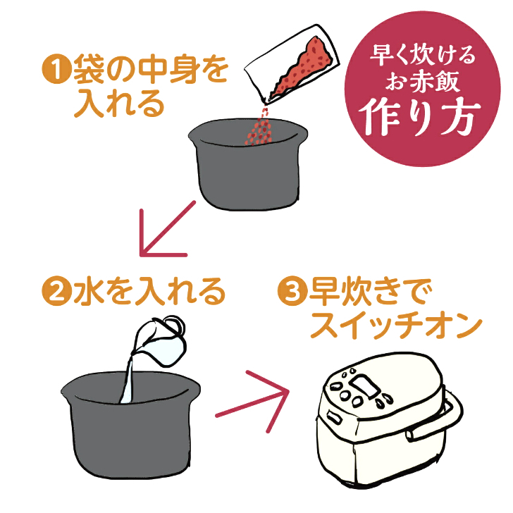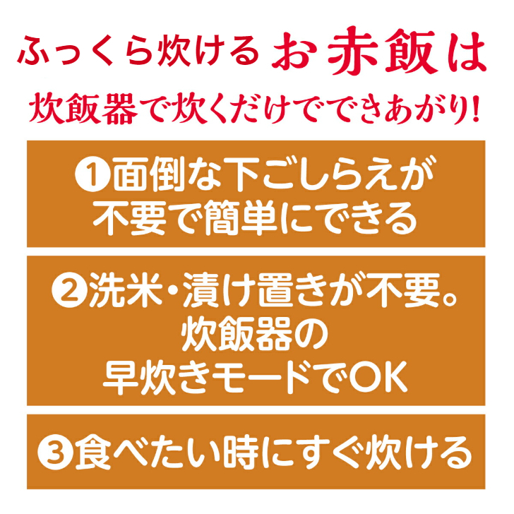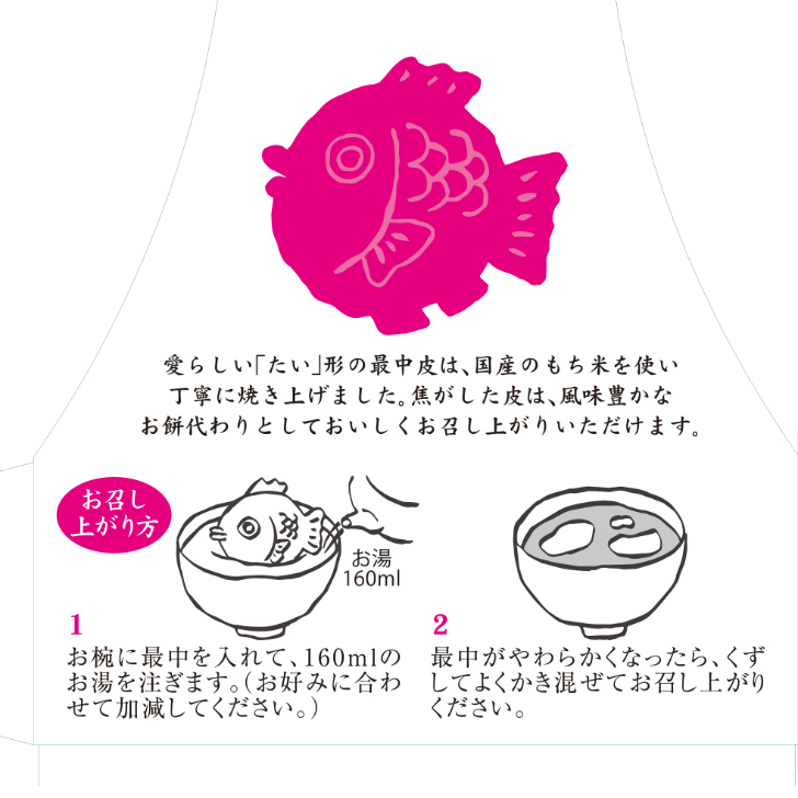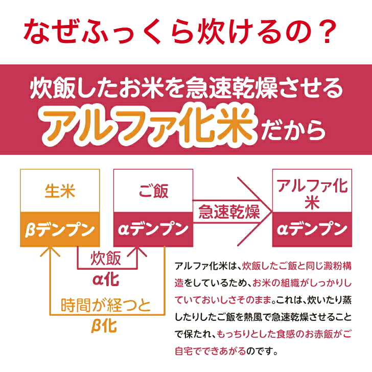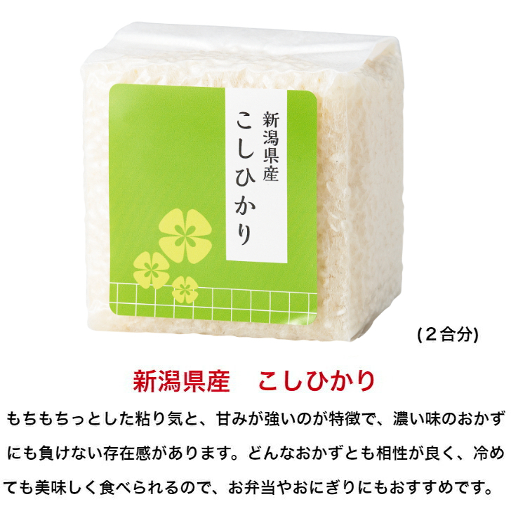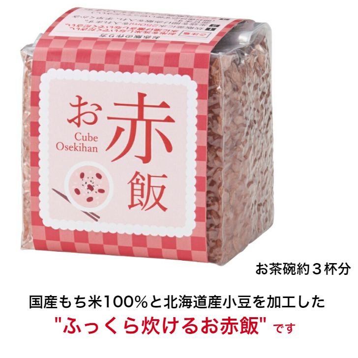 | 原材料 | 赤飯:もち米(国産)、小豆、小豆煮汁、食塩 ごま塩:ごま(国内製造)、食塩 みそ汁(赤みそ):豆みそ(大豆、食塩・国内製造)、もち米(国産)、わかめ、麩(小麦を含む)、鰹節粉末、食塩、ねぎ、砂糖、酵母エキス、ブドウ糖、デキストリン、昆布粉末/膨張剤、酸化防止剤(ビタミンE) みそ(白みそ):もち米(国産)、米みそ(大豆、米、食塩)、わかめ、麩(小麦を含む)、鰹節粉末、食塩、ねぎ、砂糖、酵母エキス、ブドウ糖、デキストリン、昆布粉末/膨張剤、酸化防止剤(ビタミンE) お茶漬け:もち米(国産)、食塩、あられ、ぶどう糖、のり、でん粉、砂糖、昆布粉末、抹茶、鰹節粉末/調味料(アミノ酸等) |