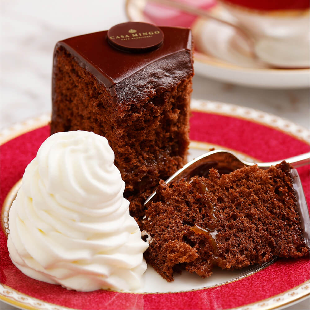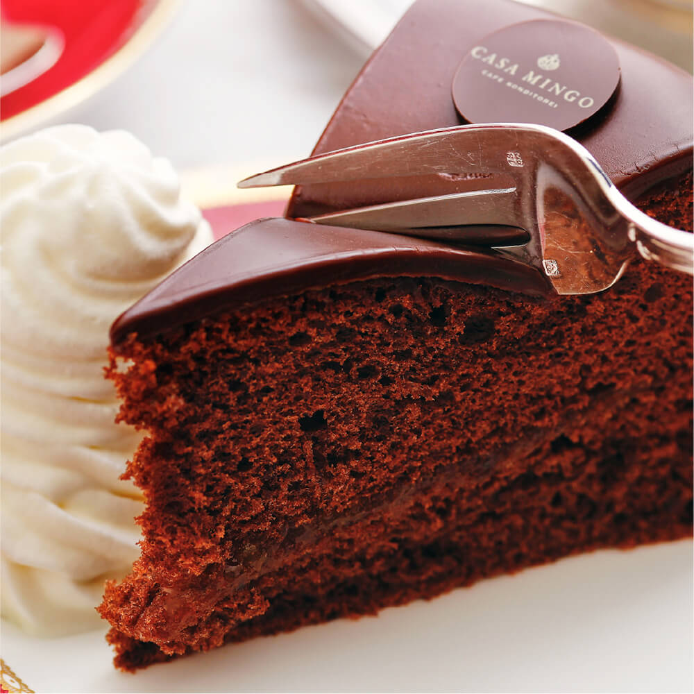ふんわりとしたチョコレートスポンジの表面とその間にアプリコットジャムをたっぷりと塗り、完璧にテンパリングされた、とろけるようなチョコレートでコーティングしました。熟練したパティシエの技術によりケーキは、まるでピアノのような美しい漆黒のツヤを放ちます。