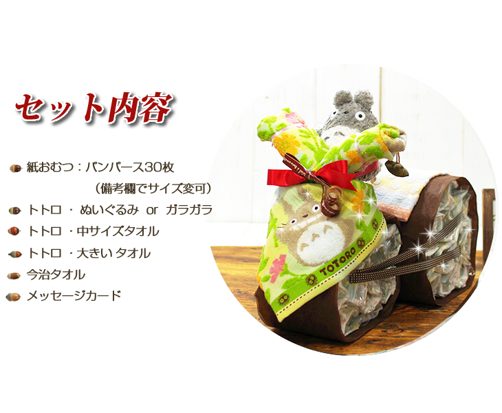 大口注文・法人のお問い合わせはこちらキュートなトトロのぬいぐるみorガラガラに、何枚あっても重宝するトトロのウォッシュタオルと、キュートなフェイスタオルがセットになった、ママにうれしいジブリシリーズのおむつバイク! おむつは、パンパース30枚が付いてお買得!男の子にも女の子にもピッタリ。 実用的なアイテムをおしゃれなギフトに仕上げています。 ※おむつの枚数はサイズによって異なります。