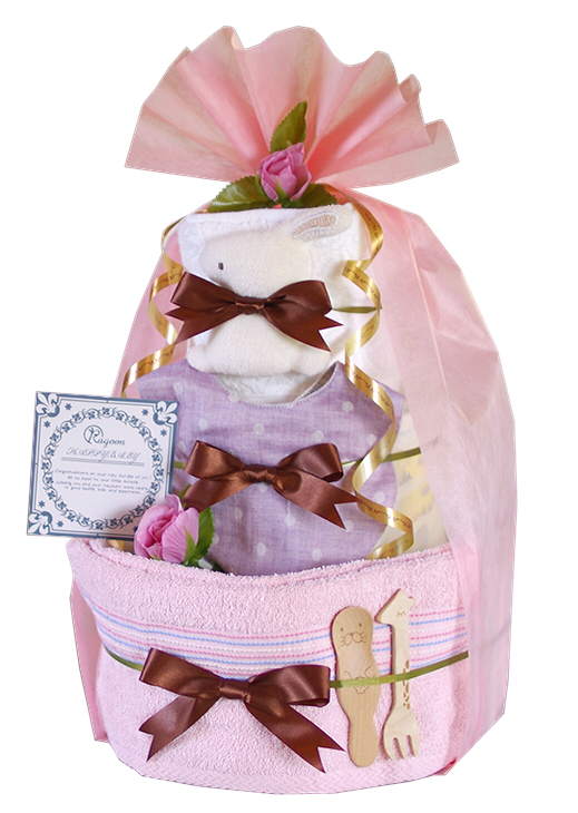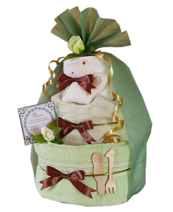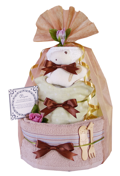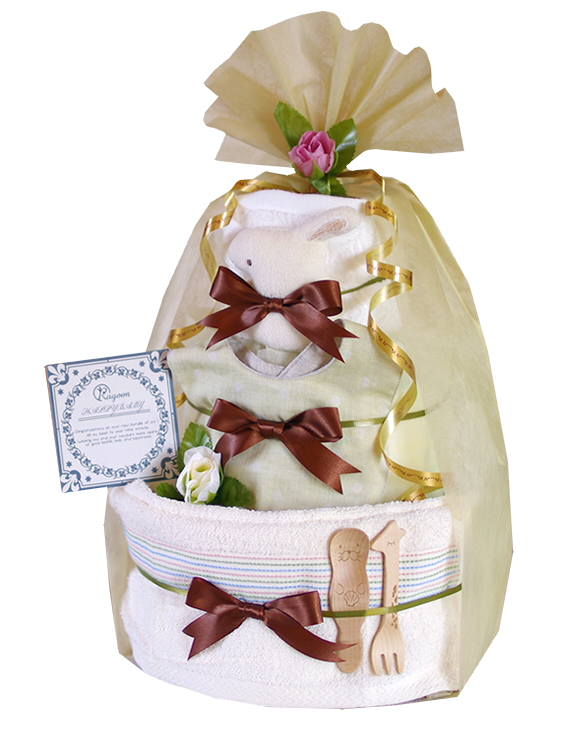 赤ちゃんには、ほんとうに、安心なものを。おしゃれなニュアンスカラーのオーガニックおむつケーキで、実用的なアイテムをおしゃれなギフトに仕上げています。ベージュ、ブルー、ピンク、グリーン、ブラウンの5色展開です。