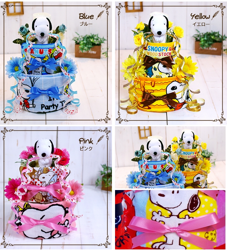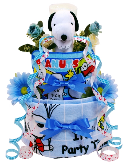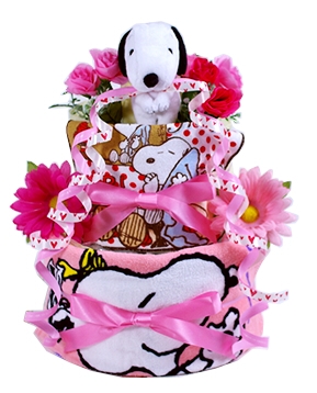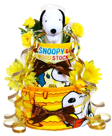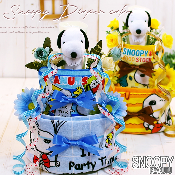 大口注文・法人のお問い合わせはこちら世代を超えて愛されているスヌーピのおむつケーキ! 実用的なのに、おしゃれな贈り物です。