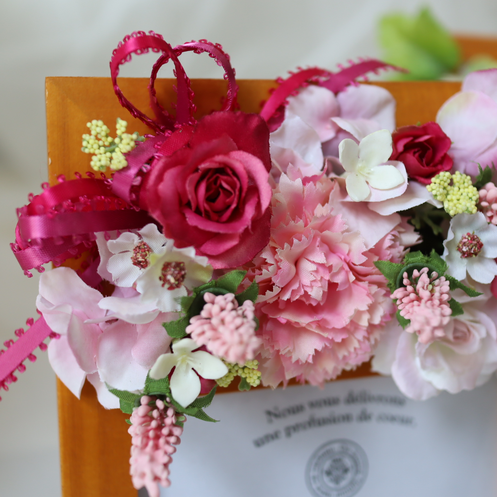 アトリエ美鈴のフラワーフォトフレームは、色鮮やかなアーティフィシャルフラワーで装飾された華やかなデザイン。退色や零れ落ちの心配がなく、どんな空間も美しく彩ります。