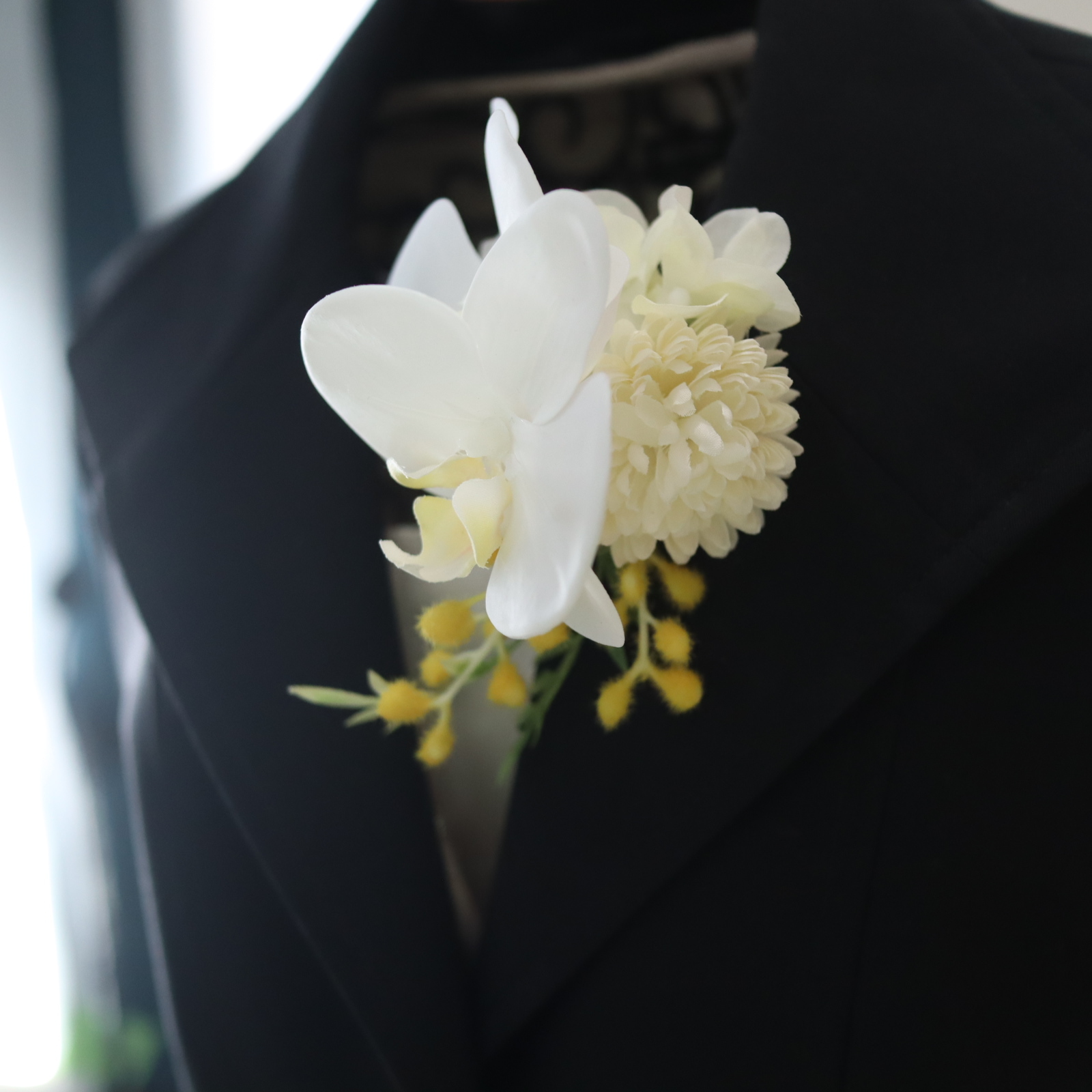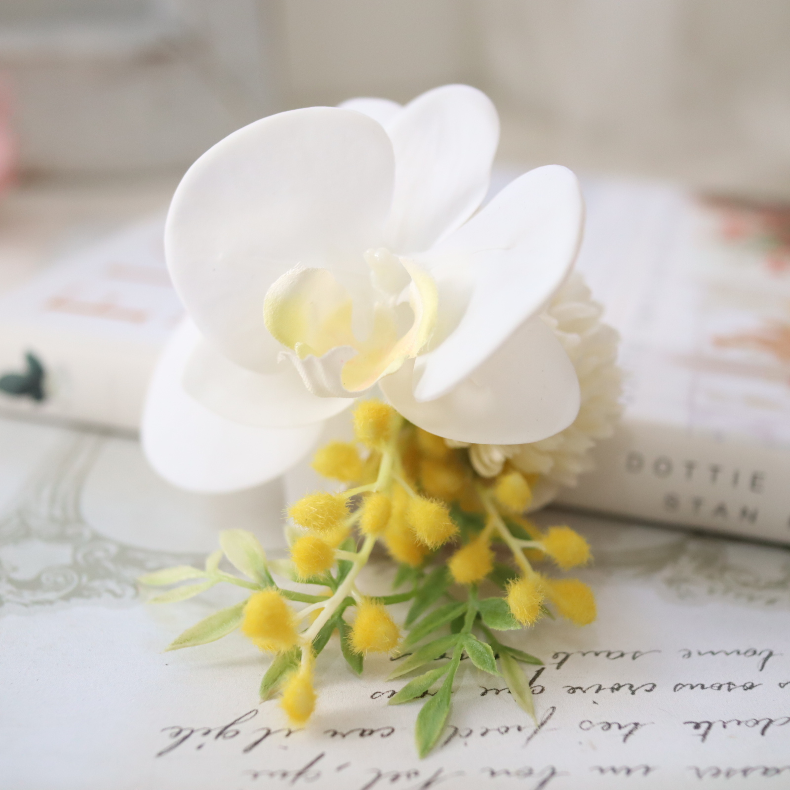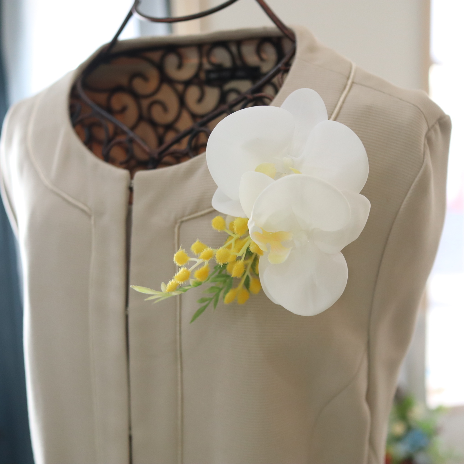 アトリエ美鈴の胡蝶蘭とミモザのコサージュは、ホワイトとイエローの爽やかな配色で、すべての年齢と性別に適した上品なアクセサリーです。長持ちするアーティフィシャルフラワーで、特別な日を美しく彩ります。