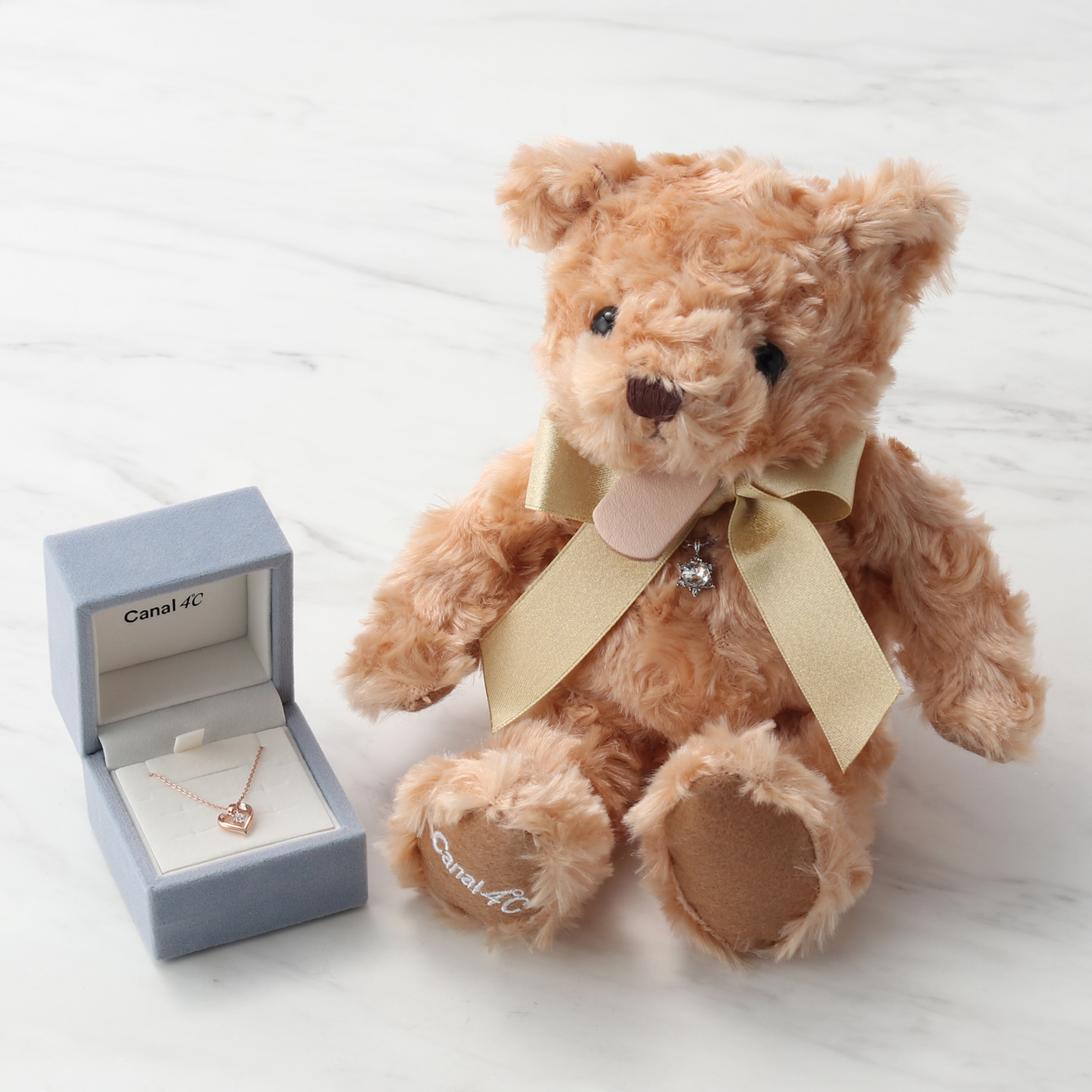 ジュエリーブランド「Canal 4℃」のタンプ限定セット。愛らしいハートモチーフ付きで女性の可愛らしさをイメージさせる、キュービックジルコニアが優美に揺れ動くネックレスと、この冬限定デザインのオリジナルベアをセットにしてお届けします。