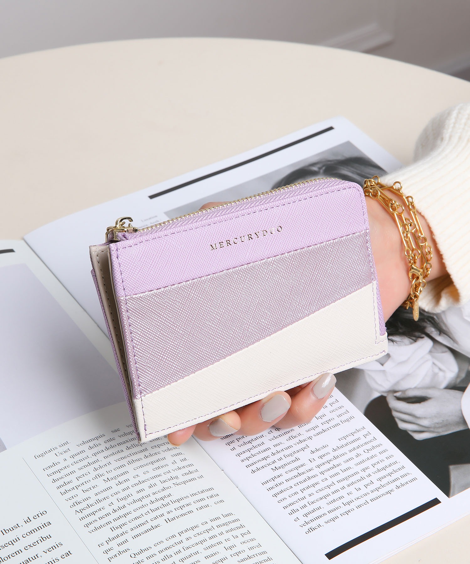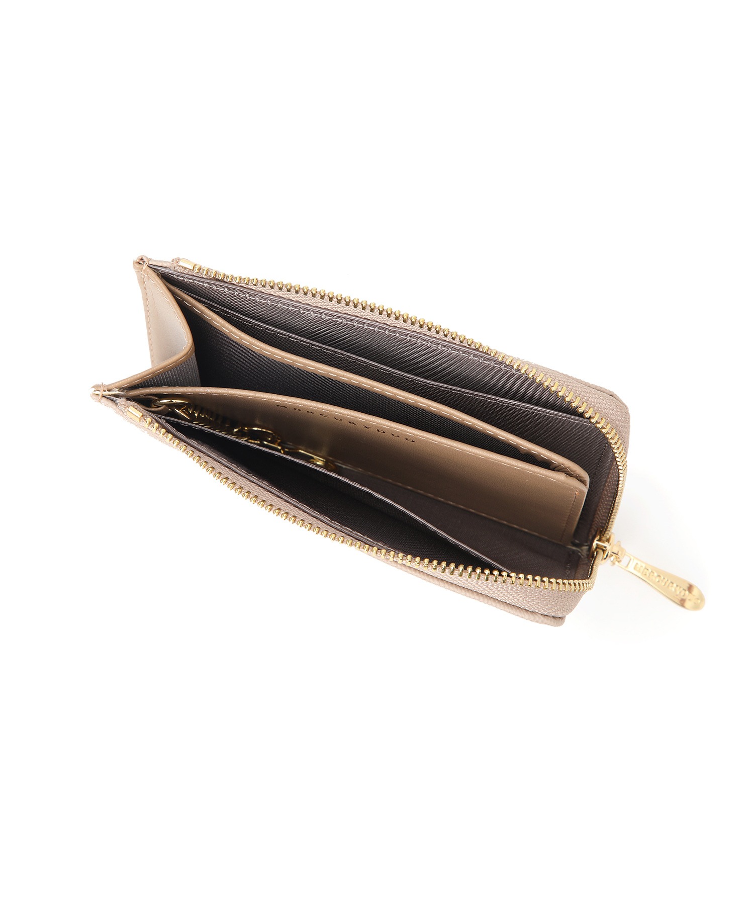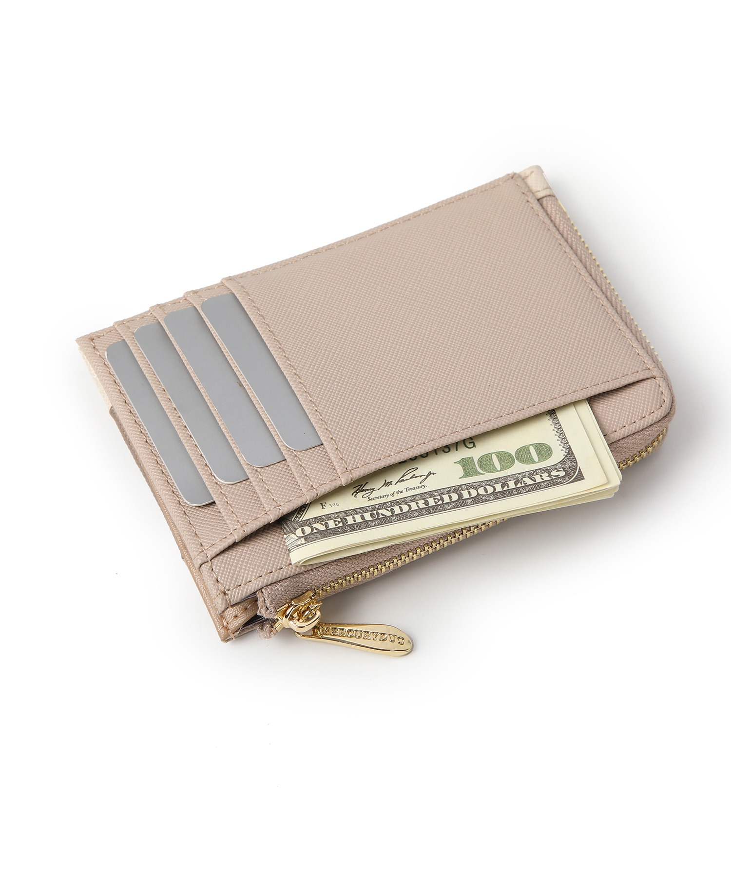 L字開閉ジップでスムーズな出し入れが可能。カード、お札、小銭をコンパクトに持ち歩ける機能性を備え、ミニバッグにもぴったりのサイズ感です。