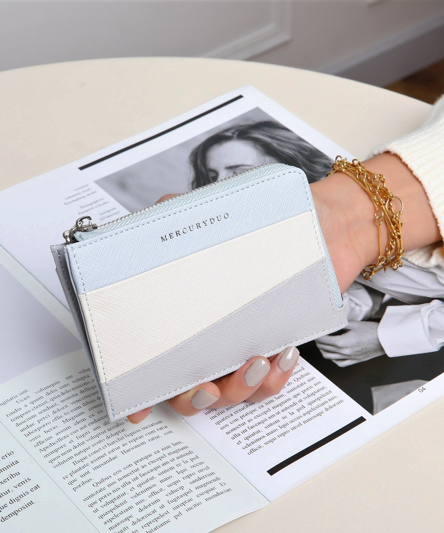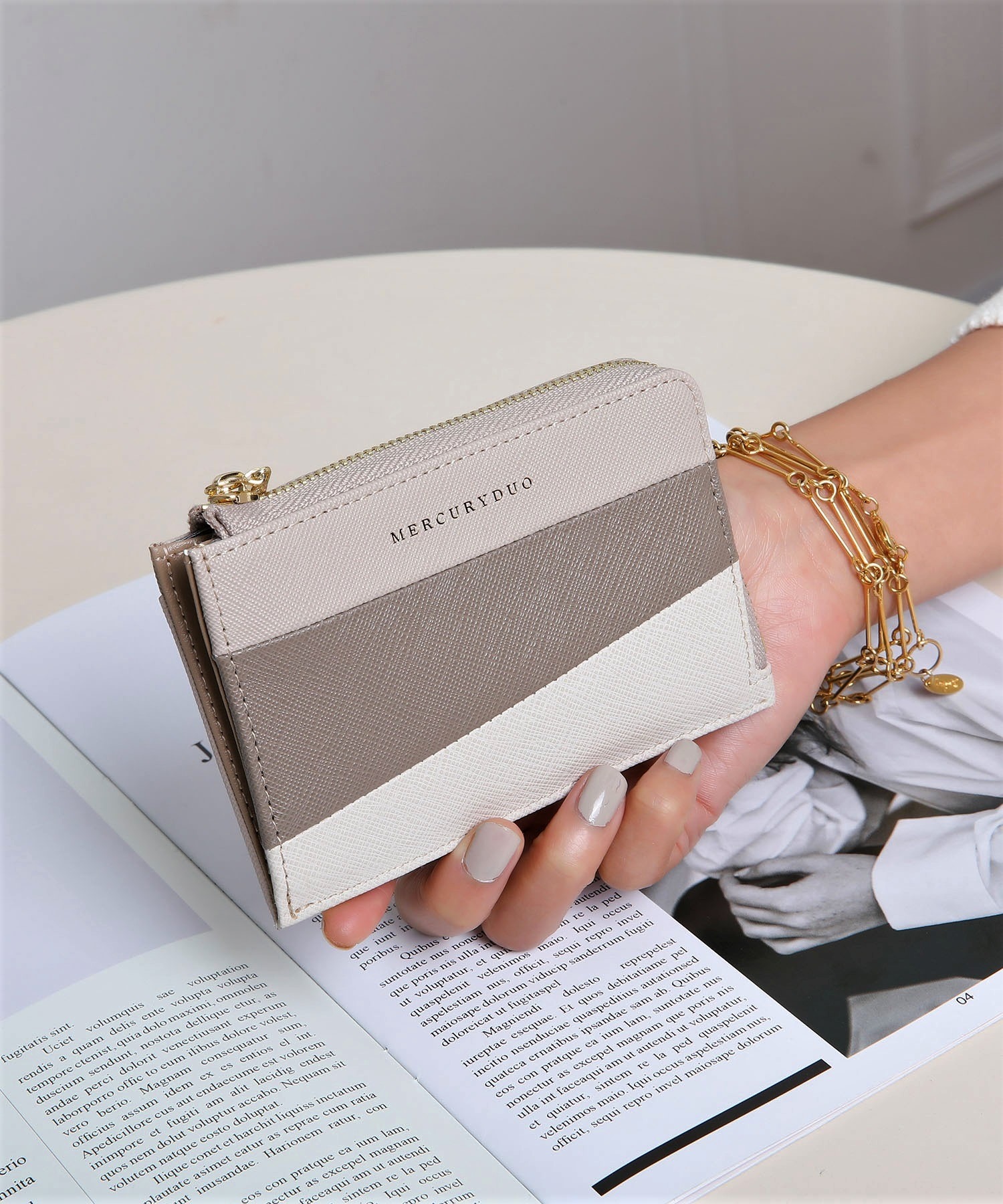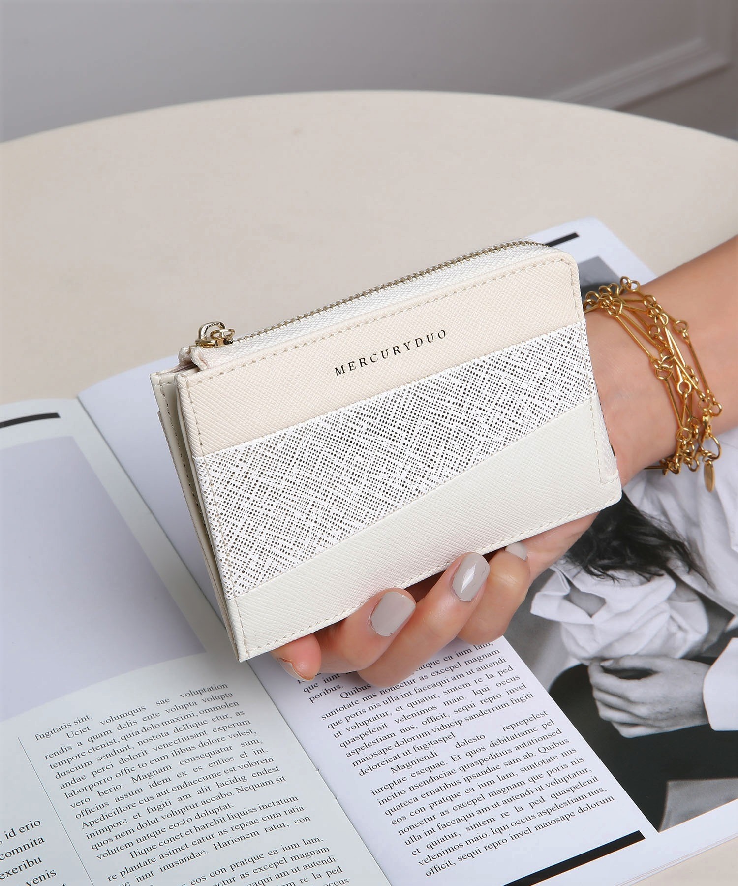 L字開閉ジップでスムーズな出し入れが可能。カード、お札、小銭をコンパクトに持ち歩ける機能性を備え、ミニバッグにもぴったりのサイズ感です。