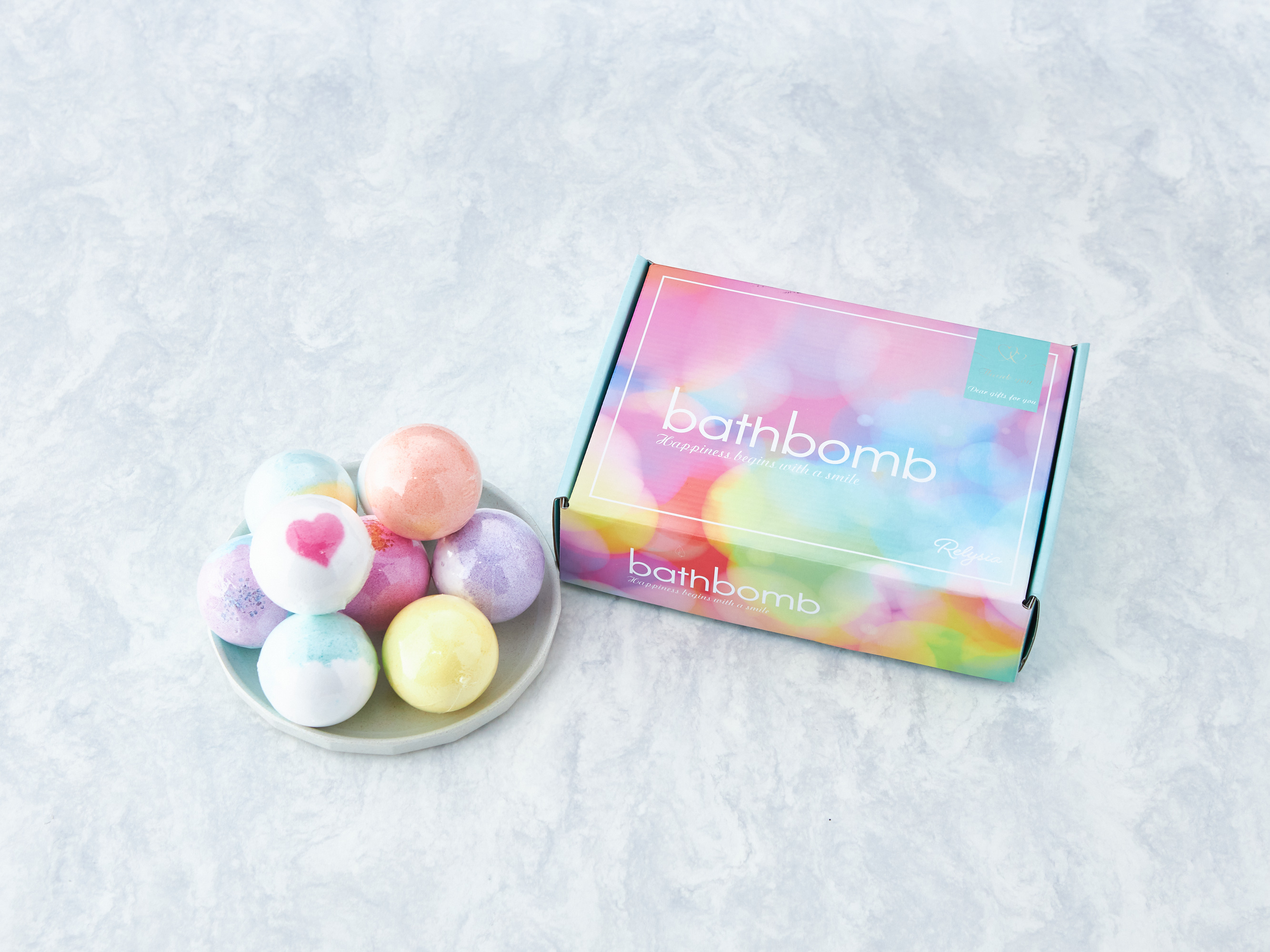 毎日のバスタイムがいっそう楽しくなる「レリシアバスボム12個セット」が誕生しました。 ギフトとして送りたくなる、受け取って笑顔になれる商品として、とにかくパッケージにこだわり設計しました。 バスボムは1個ずつフィルムに包まれており、開けるのに便利なカッターがついているのも、プレゼントする方への嬉しい気遣いポイントです。