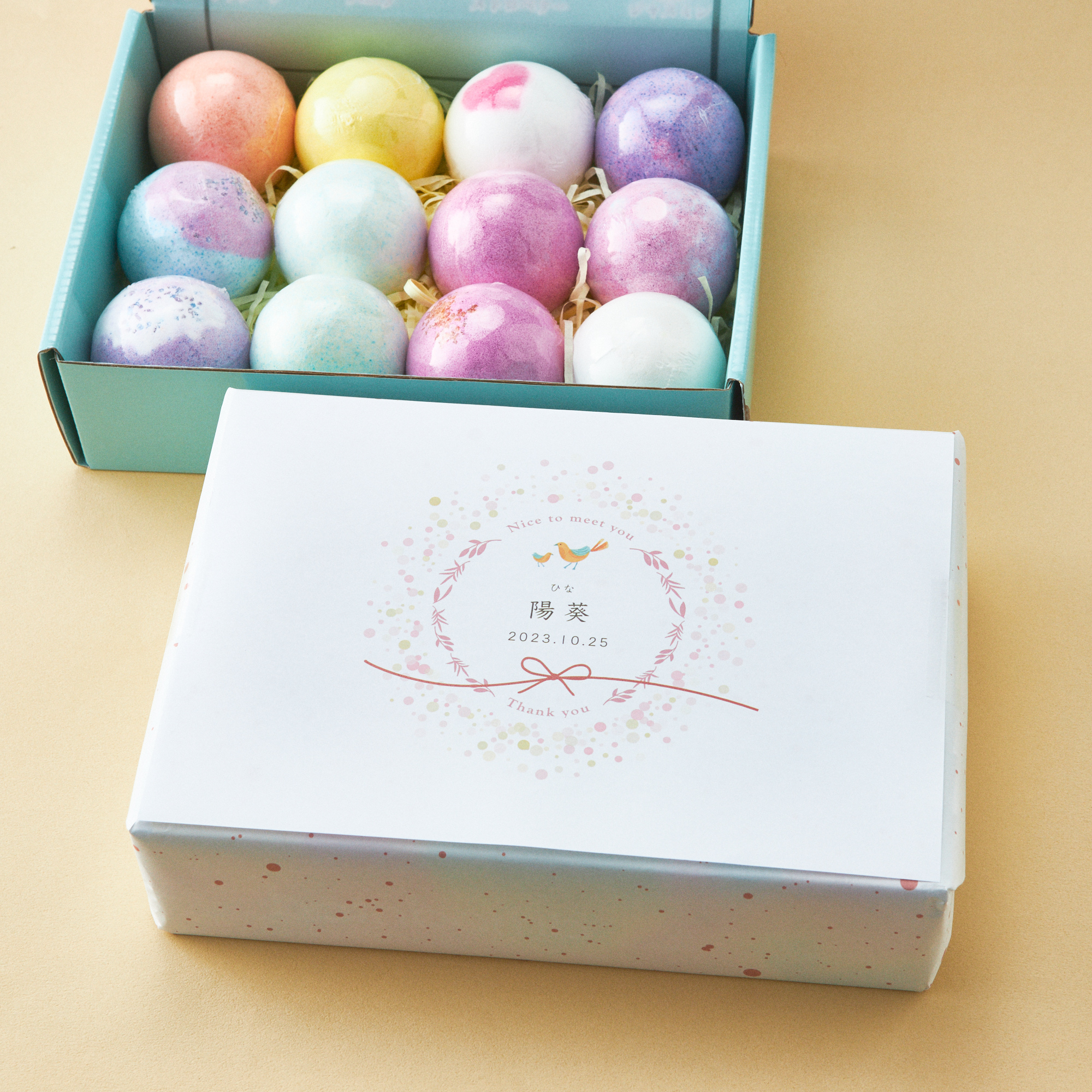 毎日のバスタイムがいっそう楽しくなる、香り豊かでカラフルな「レリシアバスボム12個セット」です。デリケートな肌質に安心の成分のみを使用しています。可愛いパッケージで、1個ずつラッピングしてプチギフトとしてもご利用いただけます。特別なお返しや出産内祝いにぴったりの「名入れ」ギフト。3種のイラストをご用意しております。