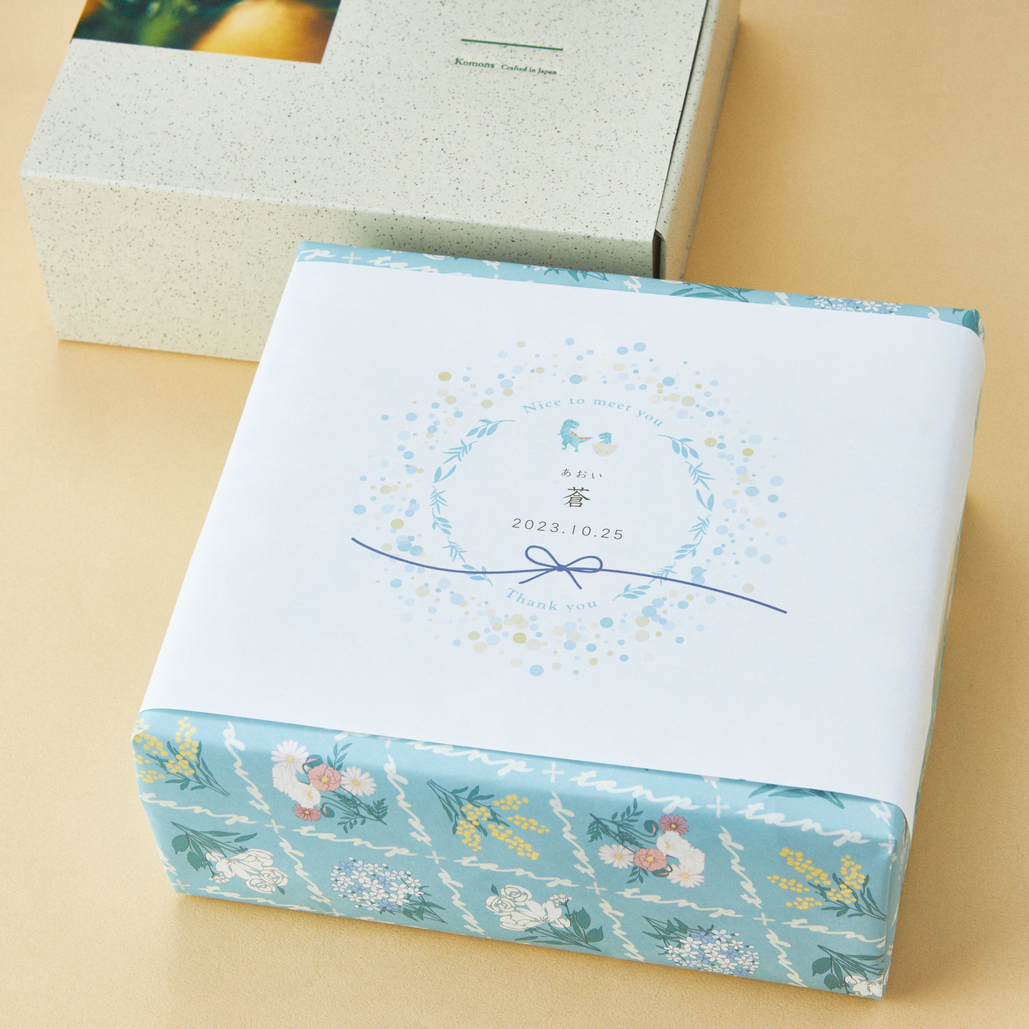 3種のイラストをご用意しております。 オプション選択画面にてご選択ください。(有料オプション) 名入れ(出産内祝い)と包装紙を併用していただくと画像のようにラッピングさせていただきます。 ※画像は別商品のため名入れと商品の向き等が異なる場合がございます ※名入れ(出産内祝い)のみをご選択の場合は、商品をビニールの袋に入れた上から、名入れをお付けいたします。