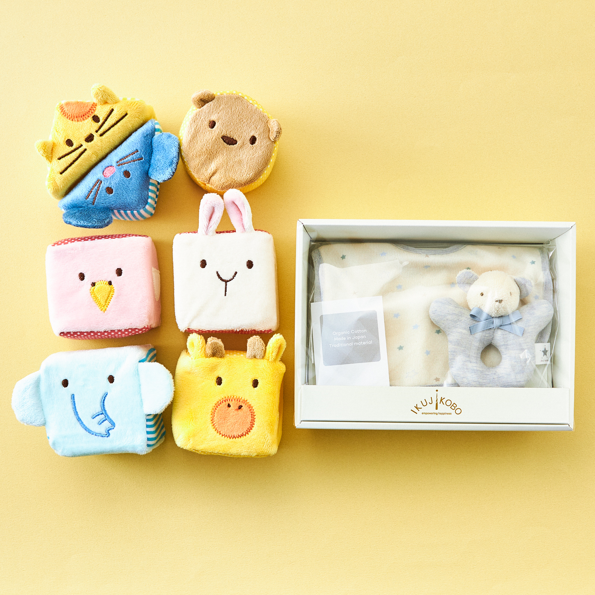 大口注文・法人のお問い合わせはこちらふわふわアニマルブロックとかわいい星柄のスタイとどうぶつモチーフのラトルのギフトセットです。 ふわふわアニマルブロックは動物の柄のブロックになっていて、お子様の誕生日に贈ると子供も大人も嬉しいプレゼントです。 布製なので安全に遊ぶことができ、様々な感覚を養うことができるおもちゃです。喜ばれること間違い無しです。