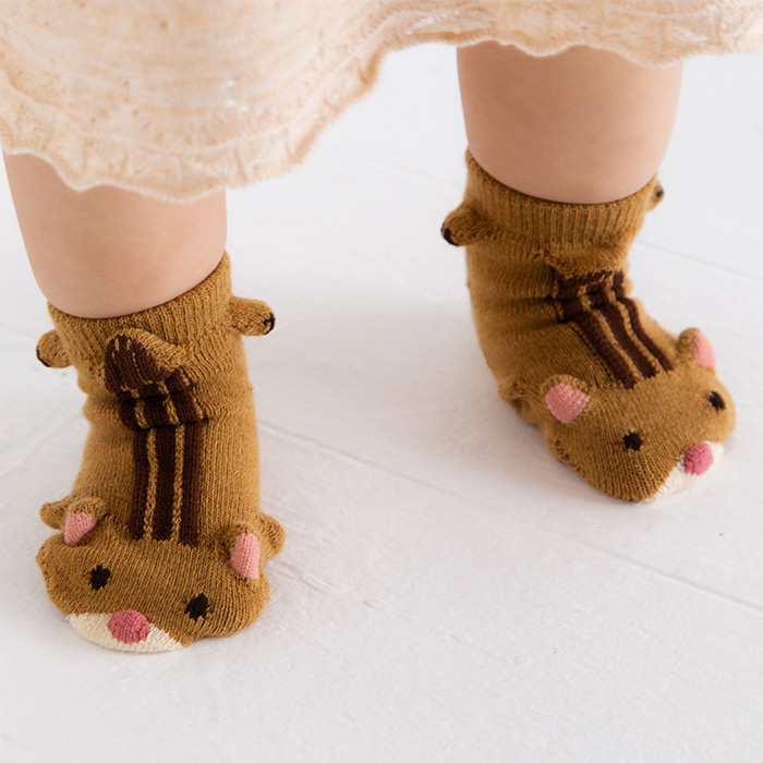 「シマリスPOP UP SOX」は、靴下の中に隠れた小さなシマリスがポコポコと顔を出す、職人技が光る一品。足元から日常に楽しさと温かみを添える、ユニークなデザインが魅力です。