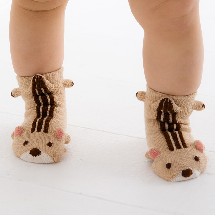 足裏には滑り止めがついており、安全に活動できるよう配慮されています。また、柔らかな素材を使用しているため、靴下が苦手なお子様でも喜んで履いていただけます。ベージュとキャメルの2色展開で、どんな服装にもマッチしやすく、男の子にも女の子にもおすすめのアイテムです。