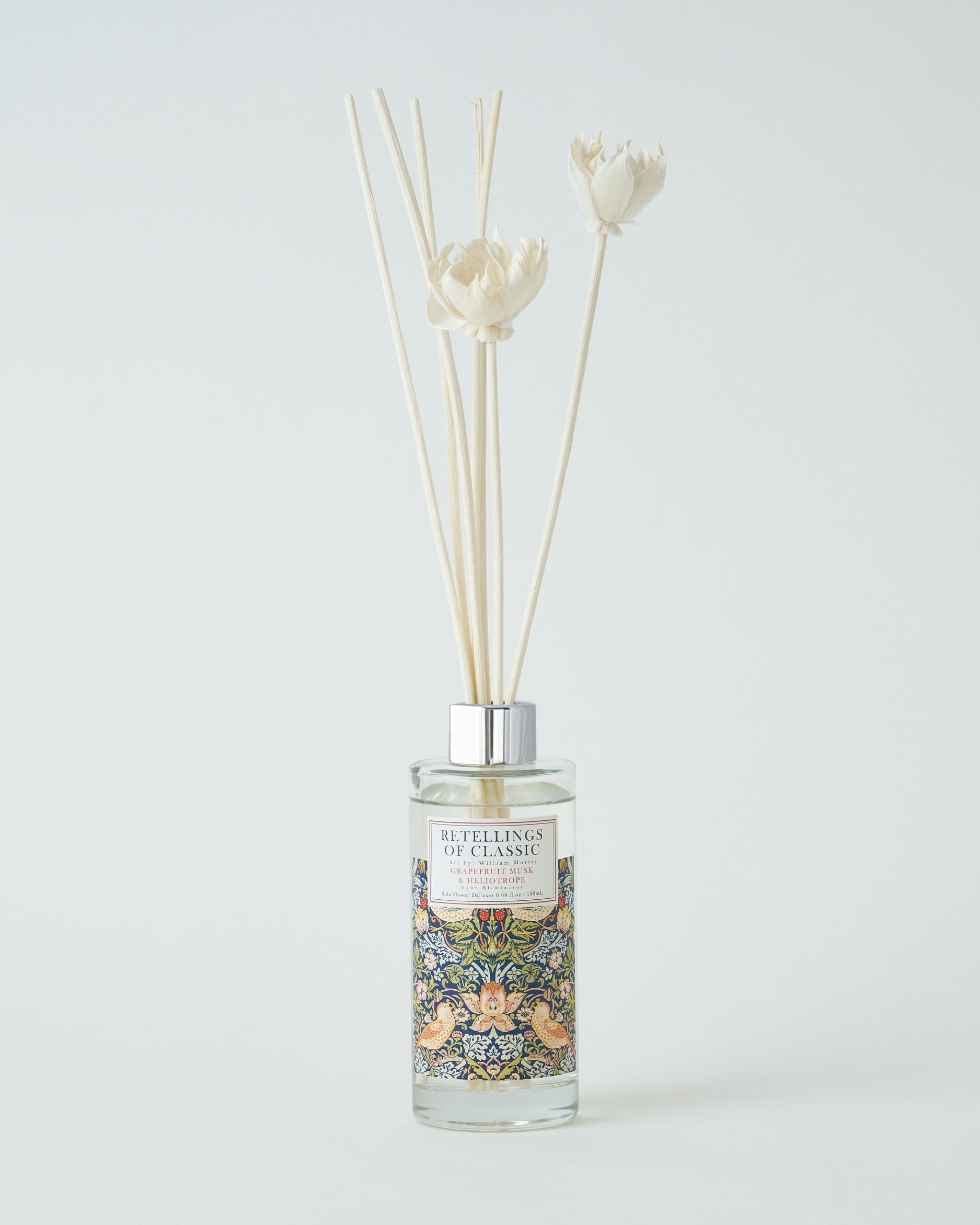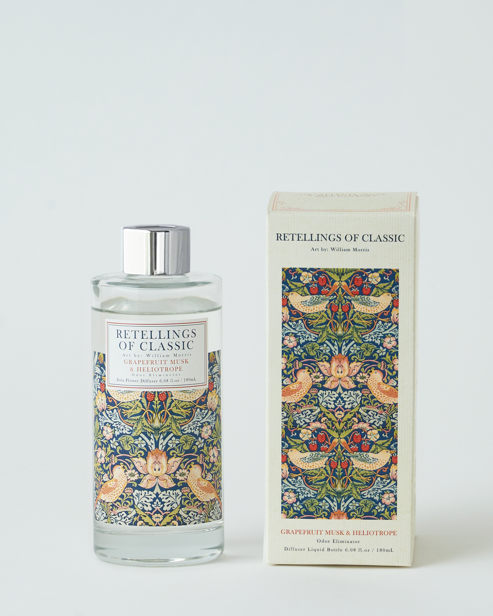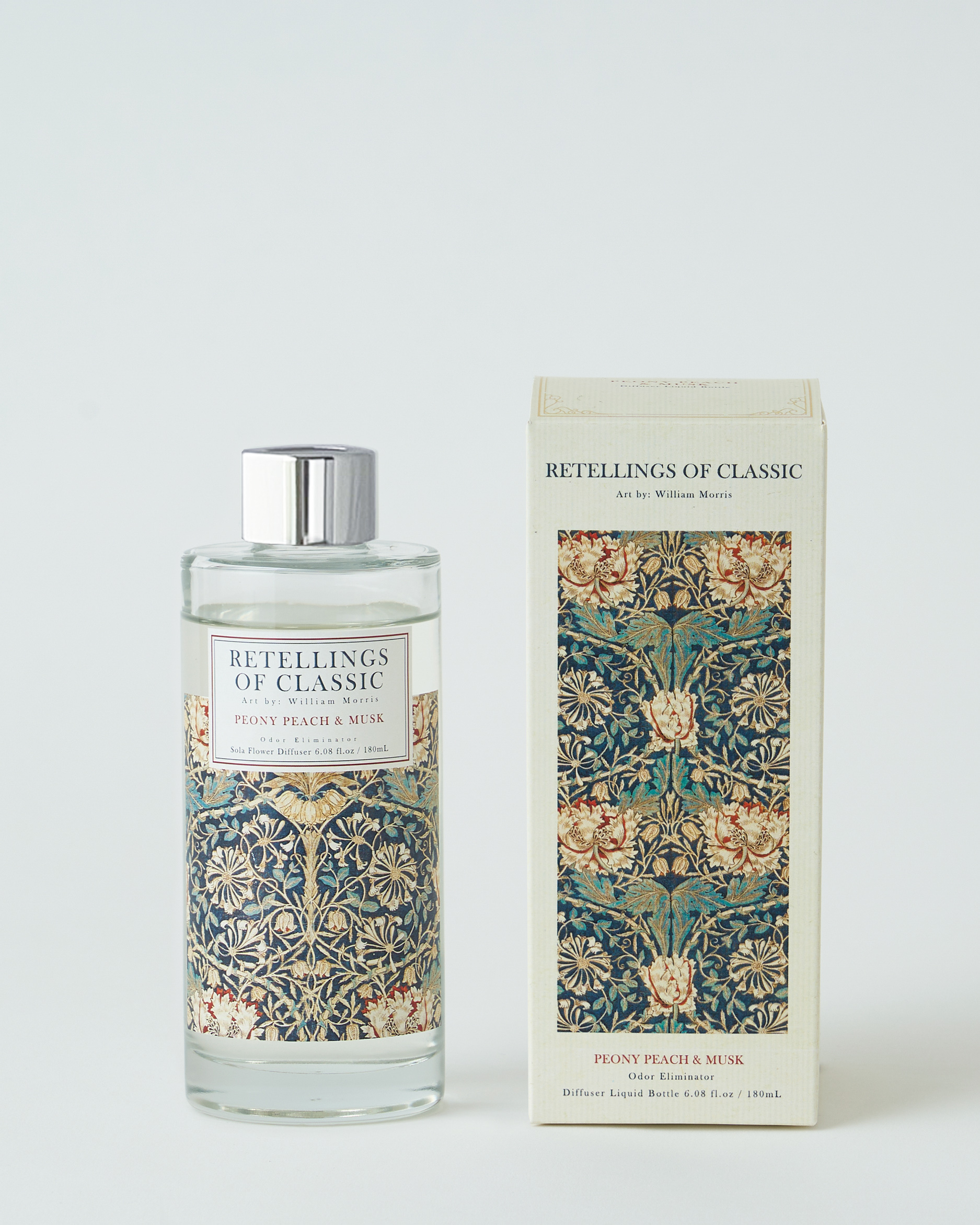 RETELLINGS OF CLASSICのDiffuser Liquid Bottleは、ウィリアム・モリスのデザインを採用した上質なフレグランスアイテムです。厳選された香りと消臭機能を兼ね備え、洗練されたライフスタイルを提案します。スティック付きなのですぐにお使いいただけます。