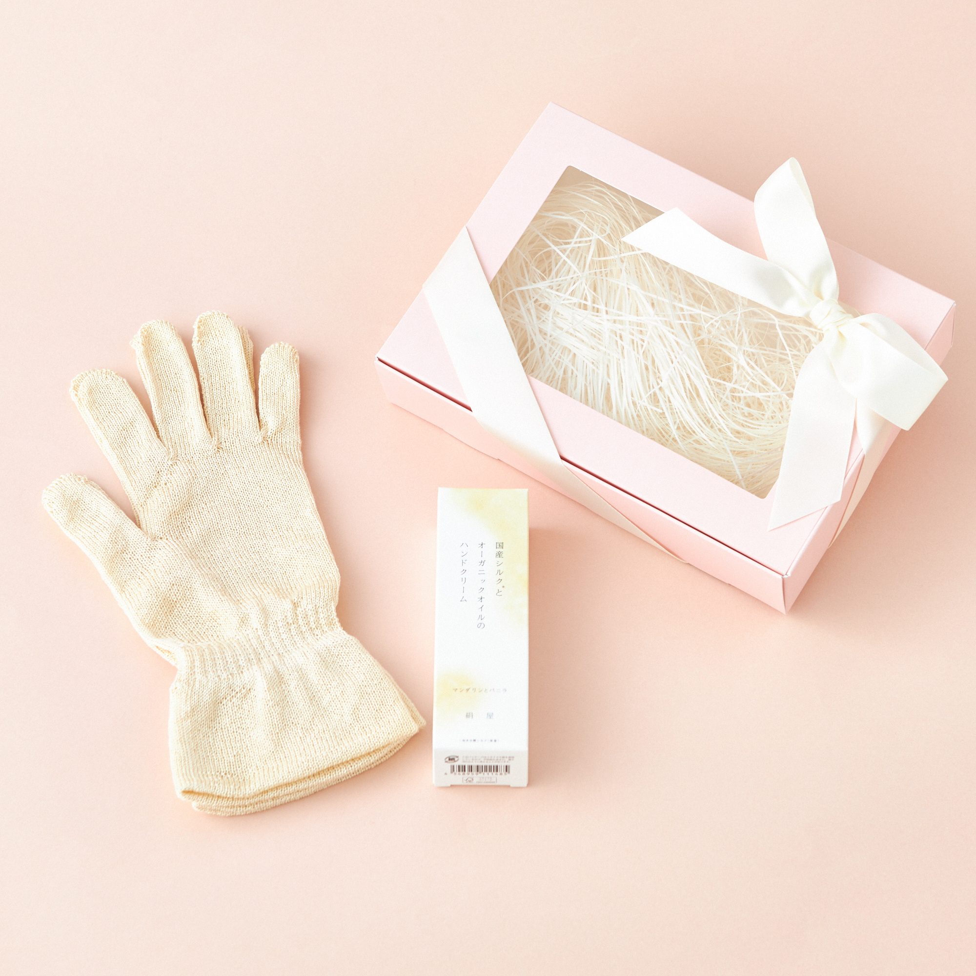 シルクを中心とした雑貨ブランド「絹屋」のショート手袋と肌に優しい国産シルクをふんだんに配合したハンドクリームのセットです。オリジナルギフトBOXでラッピングしてお届けいたします。