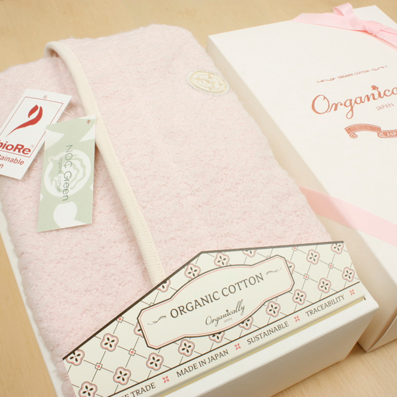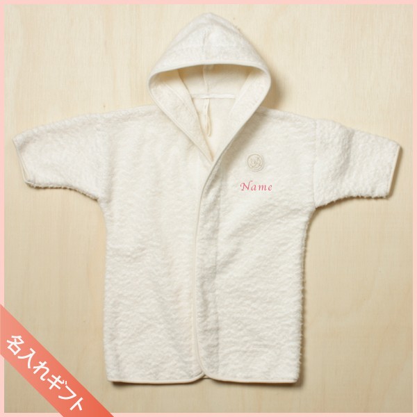 大口注文・法人のお問い合わせはこちらお風呂あがりの湯冷め解消!ママも助かる出産祝いに不動の人気NO.1ベビーバスローブ。赤ちゃんのために混じり気のない本物のオーガニックコットンを使用し、安全なパイル地を開発しました パイル生地はオーガニックコットン本来の柔らかさを保つため、タオルづくりで行われるたくさんの化学的な処理を極力行わず、天然由来の石鹸で仕上げを行うことでお肌の弱い赤ちゃんにも安心安全にご利用いただいております。 パパママが一生懸命考えた大切なお名前の入った贈物はきっと特別な出産祝いになるはずです。 バスローブはお風呂上がりにぱっと赤ちゃんに着せられ、その間にママが身支度することができるので大変便利です。生後1ヶ月から36ヶ月(3歳)過ぎまでと長くお使いいただけます。 このバスローブには厳しいNOC(日本オーガニックコットン流通機構)の製品認証基準を取得しており、その証となるタグが付いています。 また、ギフト先にもオーガニカリー商品のこだわりが伝わるように、フェアトレードで作られたことやNOC認証のオーガニックコットンを使用していることを記載したものを一緒にお送りしています。