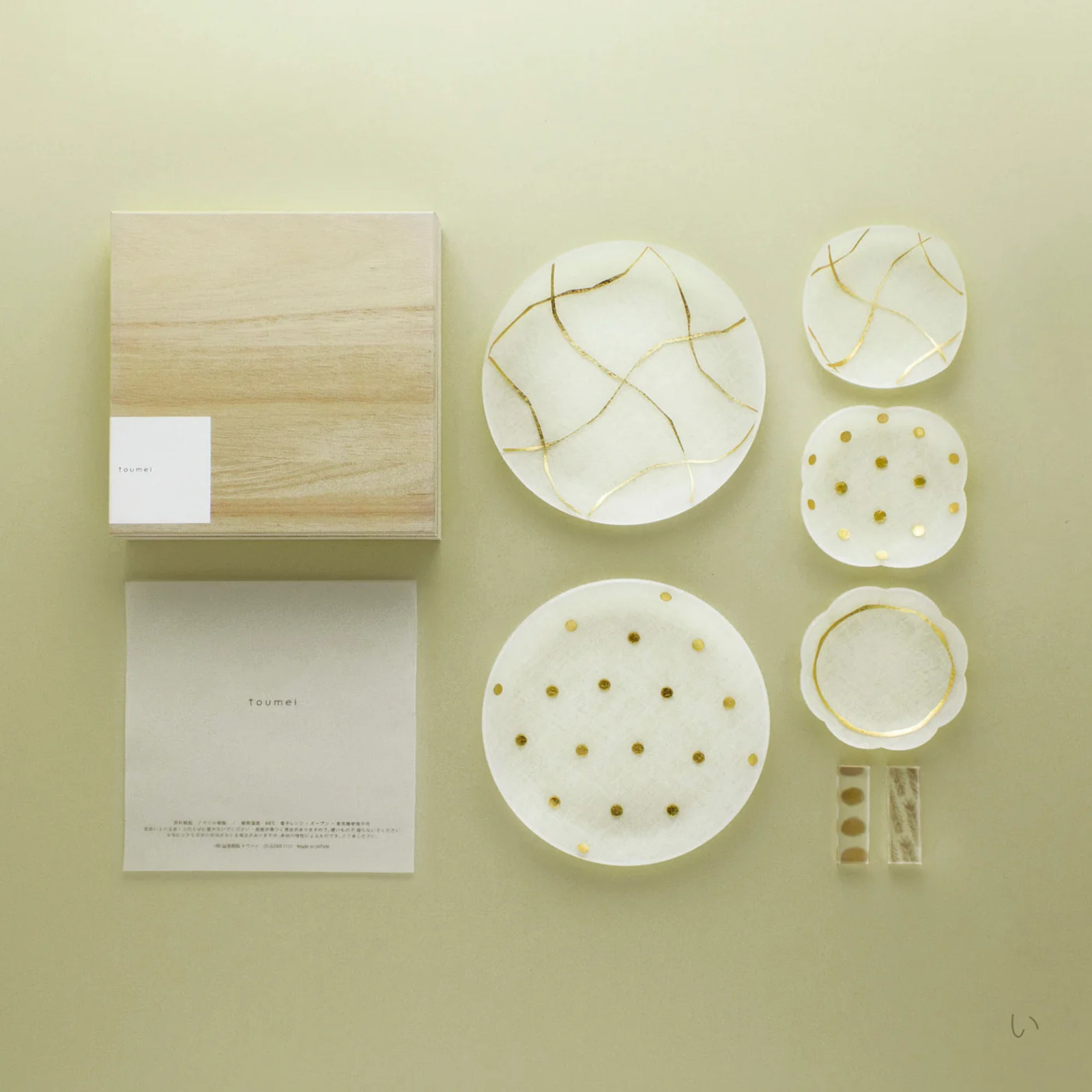 食卓を⼀層華やかに彩る、テーブルウェアのギフトセット。和紙調のアクリルに金色の箔を押した⼈気の「箔」シリーズから、プレートと小さなまめざら、はしおきの入った3種7点のセットです。ウエディングに限らずお引越しや記念日など、様々なお祝いにも。