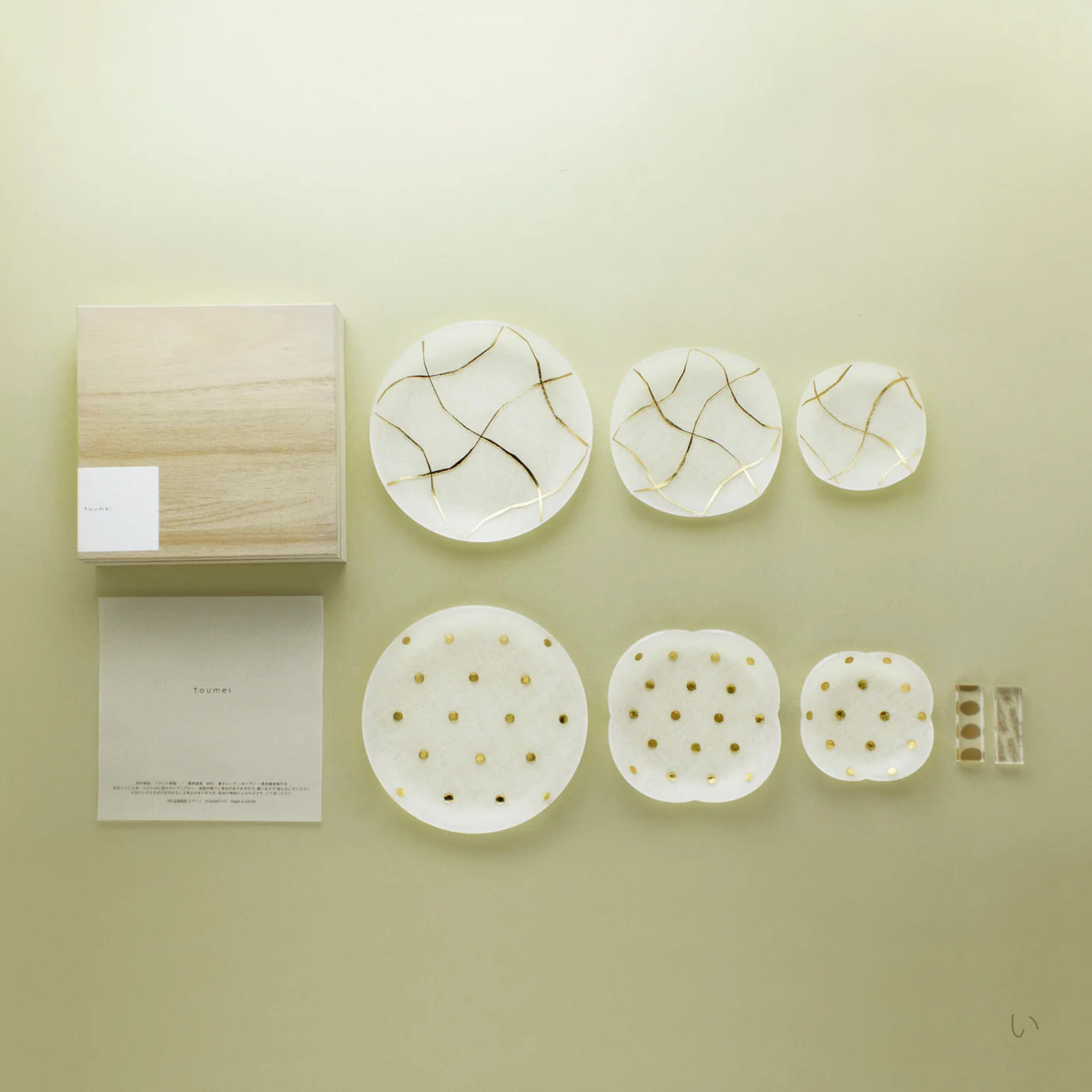 | サイズ | 箸置き:幅4.6×縦1.5×高さ0.8cm(1個) 箔plate:直径13.5cm×高さ1.5cm(1枚) 箔まめざら:直径11x高さ1cm(1枚) 箔こまめざら:直径8x高さ1cm(1枚) |