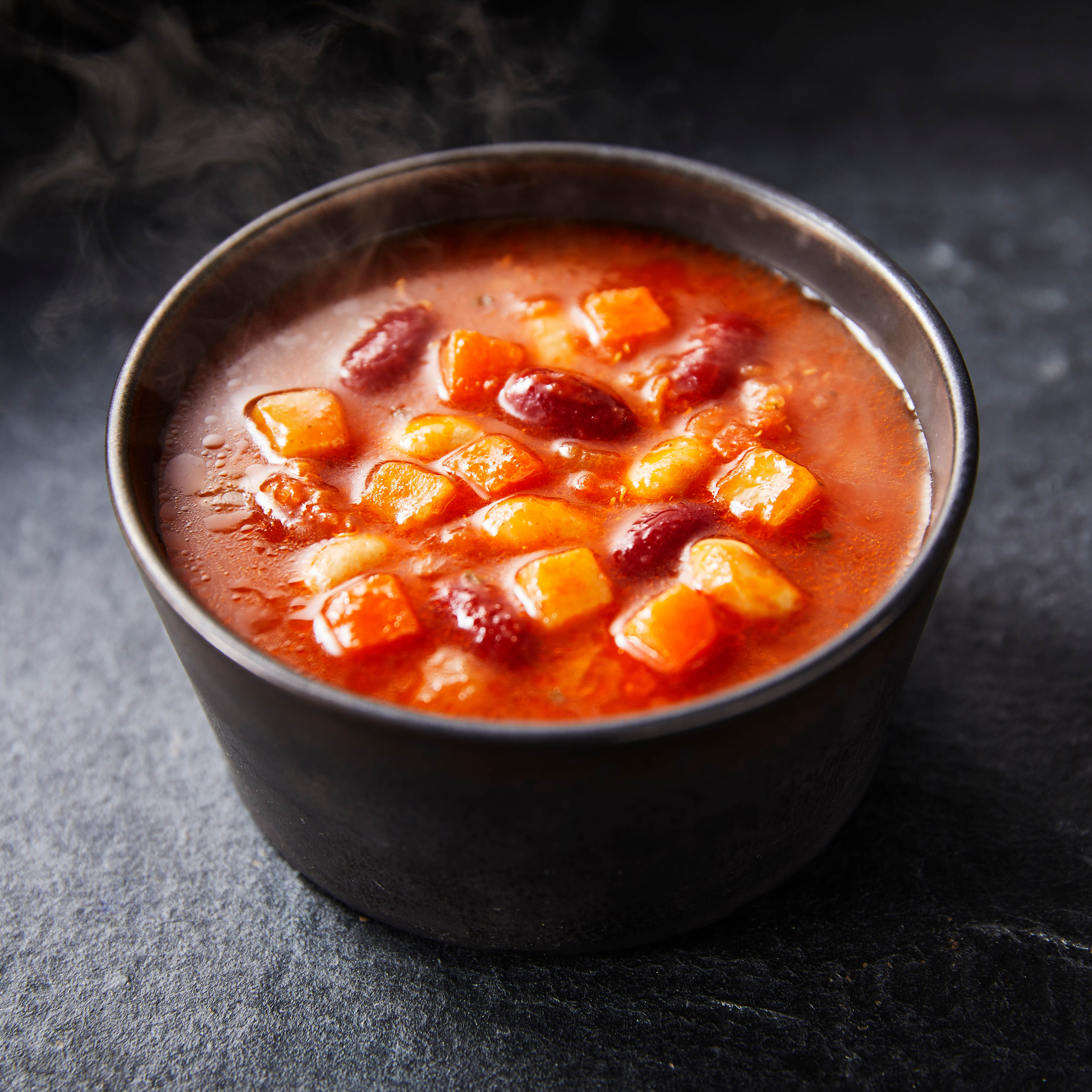 イタリアの家庭料理ミネストローネをお手本にしました。 トマトベースのスープには、相性の良いハーブを合わせ、チーズでコクをプラスしました。 具材には国産野菜、3種の豆、キヌアを加えた具だくさんチャウダーです。