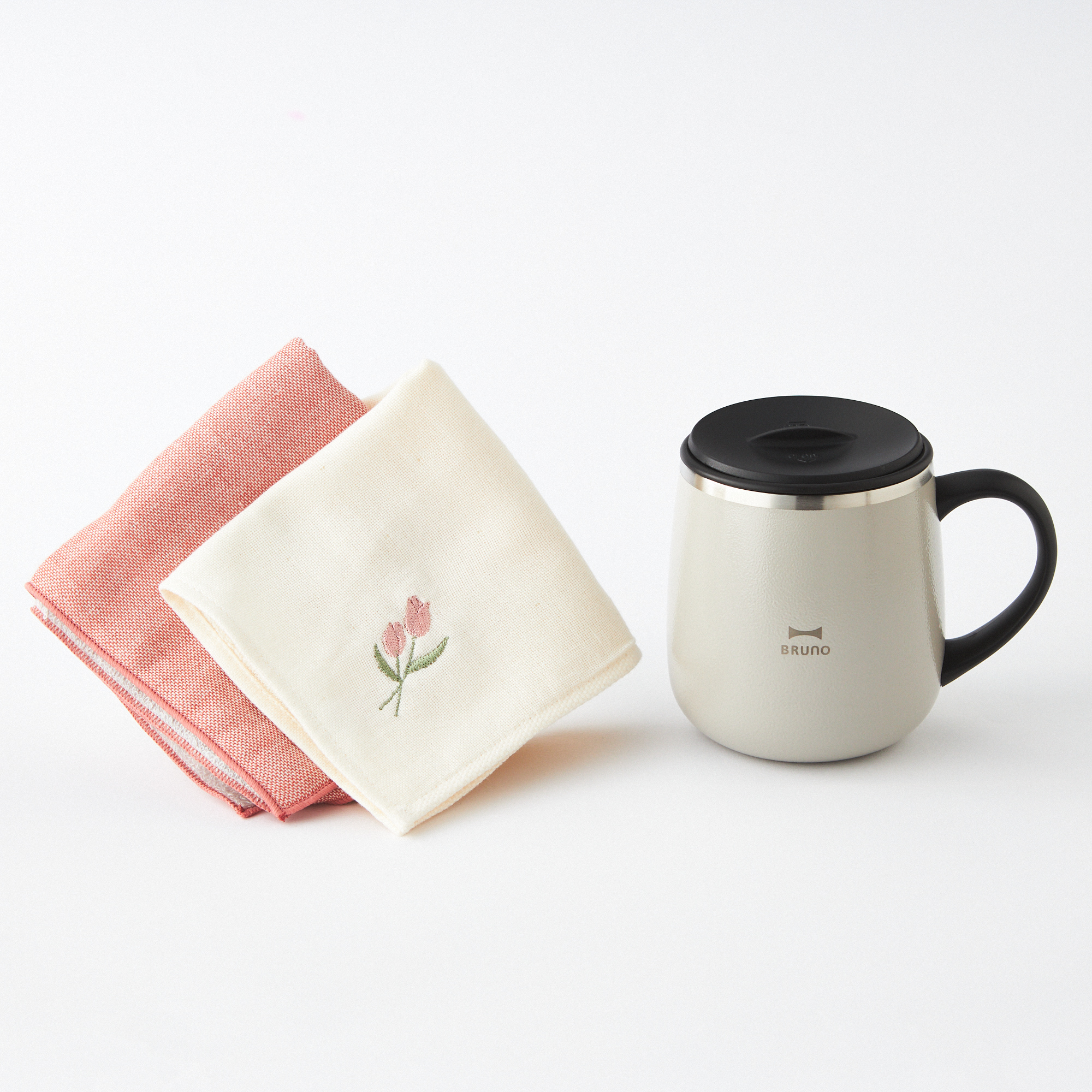 大口注文・法人のお問い合わせはこちら今治タオルブランド認定商品の刺繍の花柄が上品なレディースハンカチと品格漂う無地のガーゼハンカチ、スライド式飲み口の蓋つきでしっかり適温がキープできる「蓋つきステンレスマグshort」のセットです。