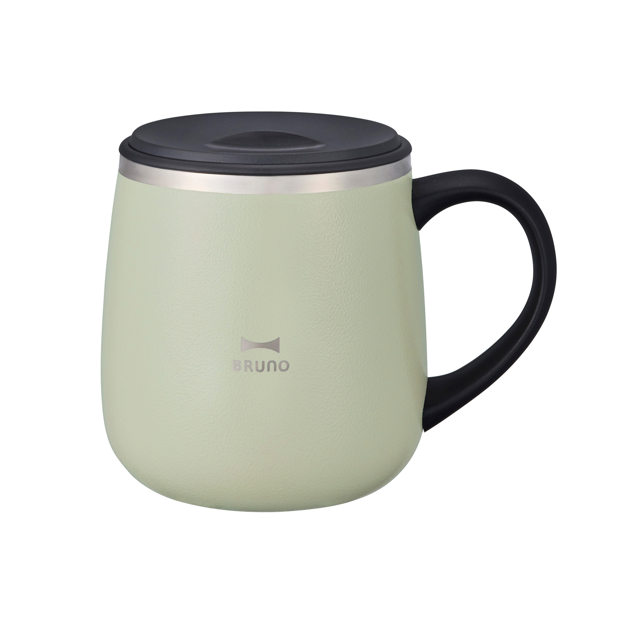 真空二重構造で、冷たい飲み物も温かい飲み物も、しっかり適温キープ。 スライド式飲み口の蓋つきで、中身がこぼれにくく持ち運びも楽々です。アウトドアはもちろん、リモートワークやベランピングにも大活躍。 ざらっとした質感とシックなカラーが絶妙なバランスのステンレスマグです。 BRUNOのロゴがワンポイント。