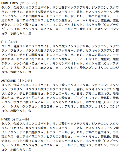 ■for Personal color:Spring/春 濁りのない明るい暖色の4色展開。 イエローベースの「パーソナルカラー:春」の人には、春の日差しのような健康的で透明感のある暖色系がおすすめ。