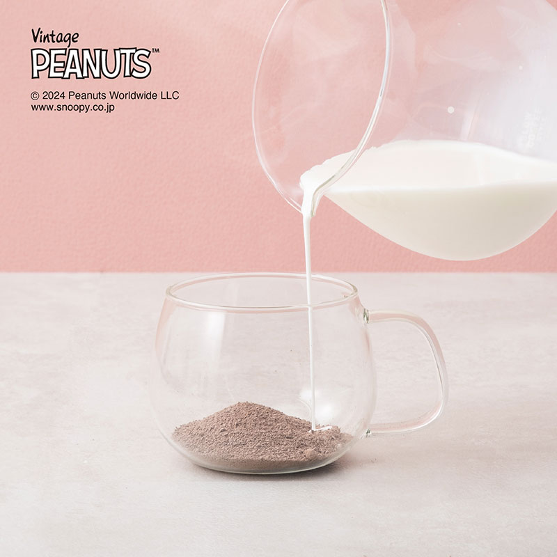 ホットチョコパウダーとマシュマロショコラのスペシャルセット。スヌーピーデザインの小瓶に入ったチョコパウダーを、温めたミルクに溶かせば、カカオの香り高いホットチョコレートドリンクが手軽に楽しめます!超濃厚なチョコレート尽くしの贅沢ドリンク。
