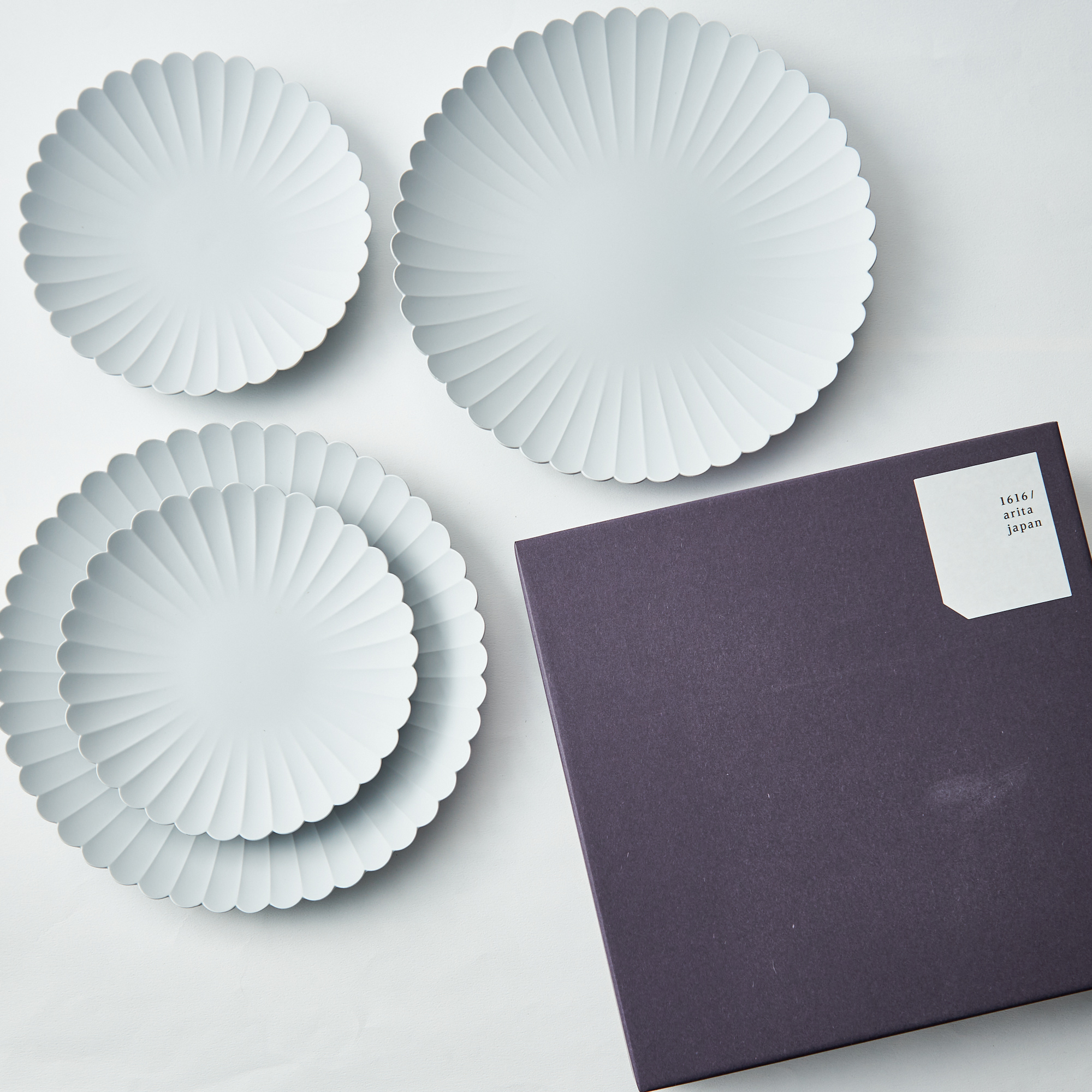 1616/arita japan TYパレス160/220プレートセットは、菊花の美しさを象徴するデザインと高密度陶土で作られた強度のあるライトグレーの器。シンプルでありながらも、現代の食生活に対応する機能性と耐久性を兼ね備えています。2つのサイズを2枚ずつセットでお届けします。