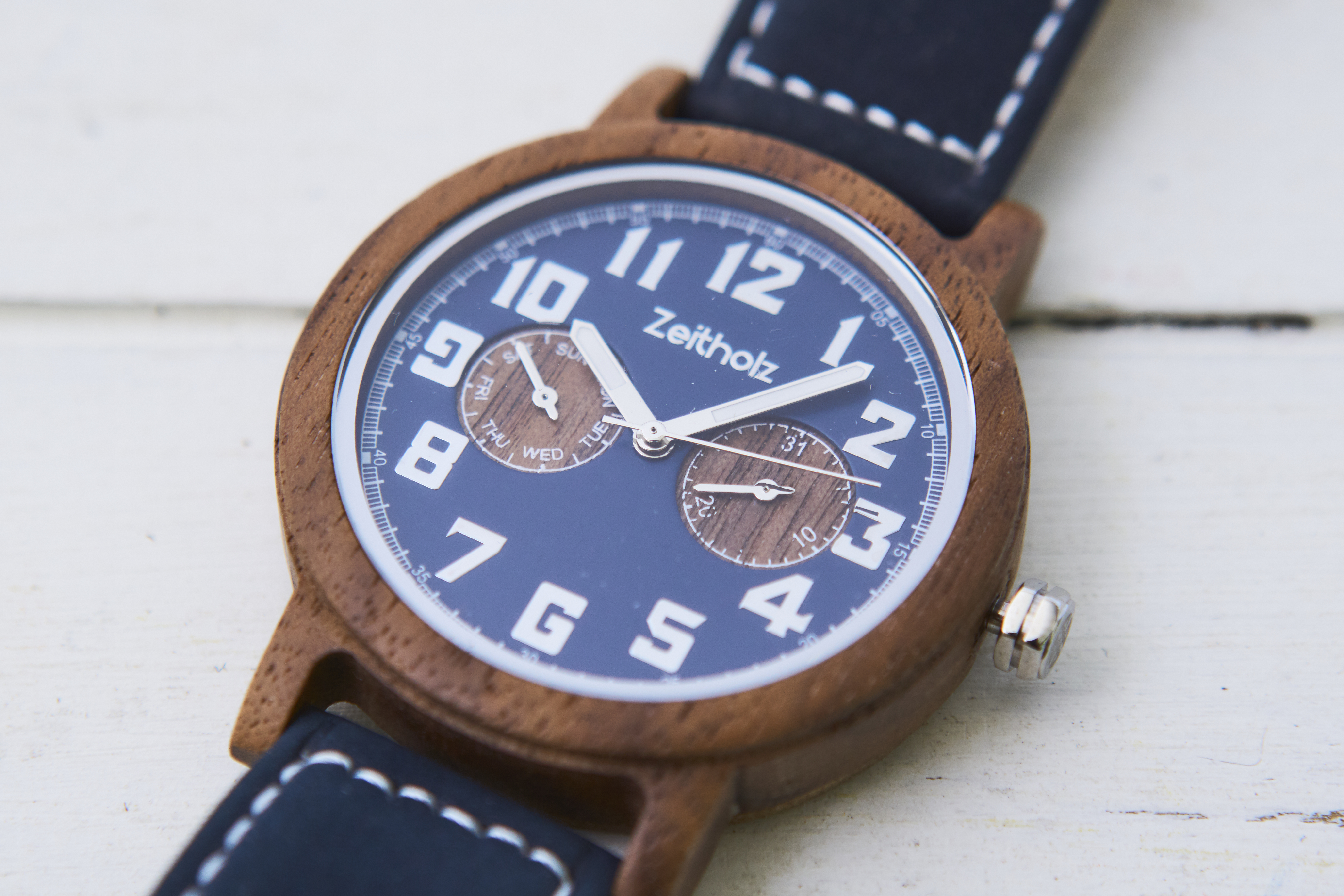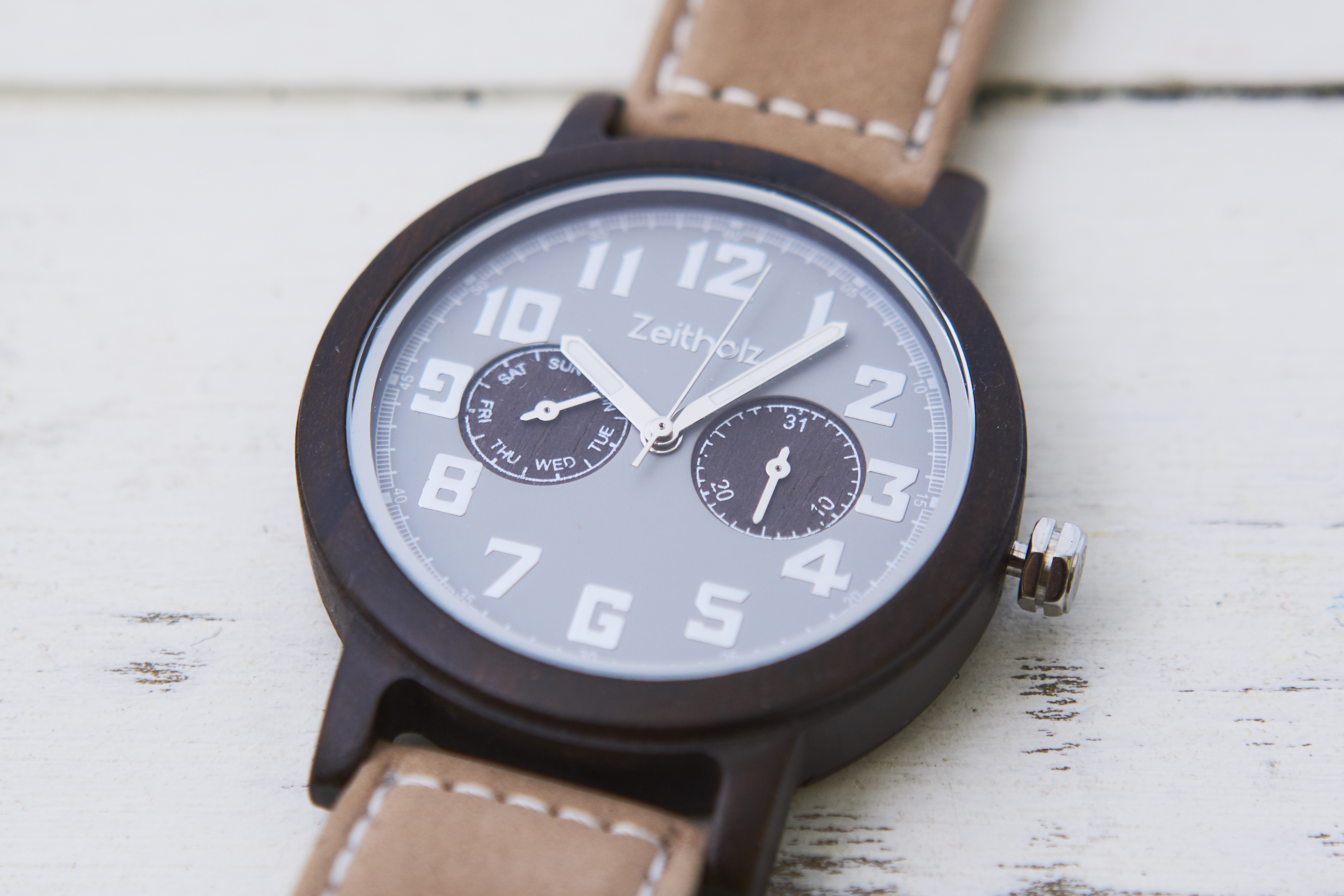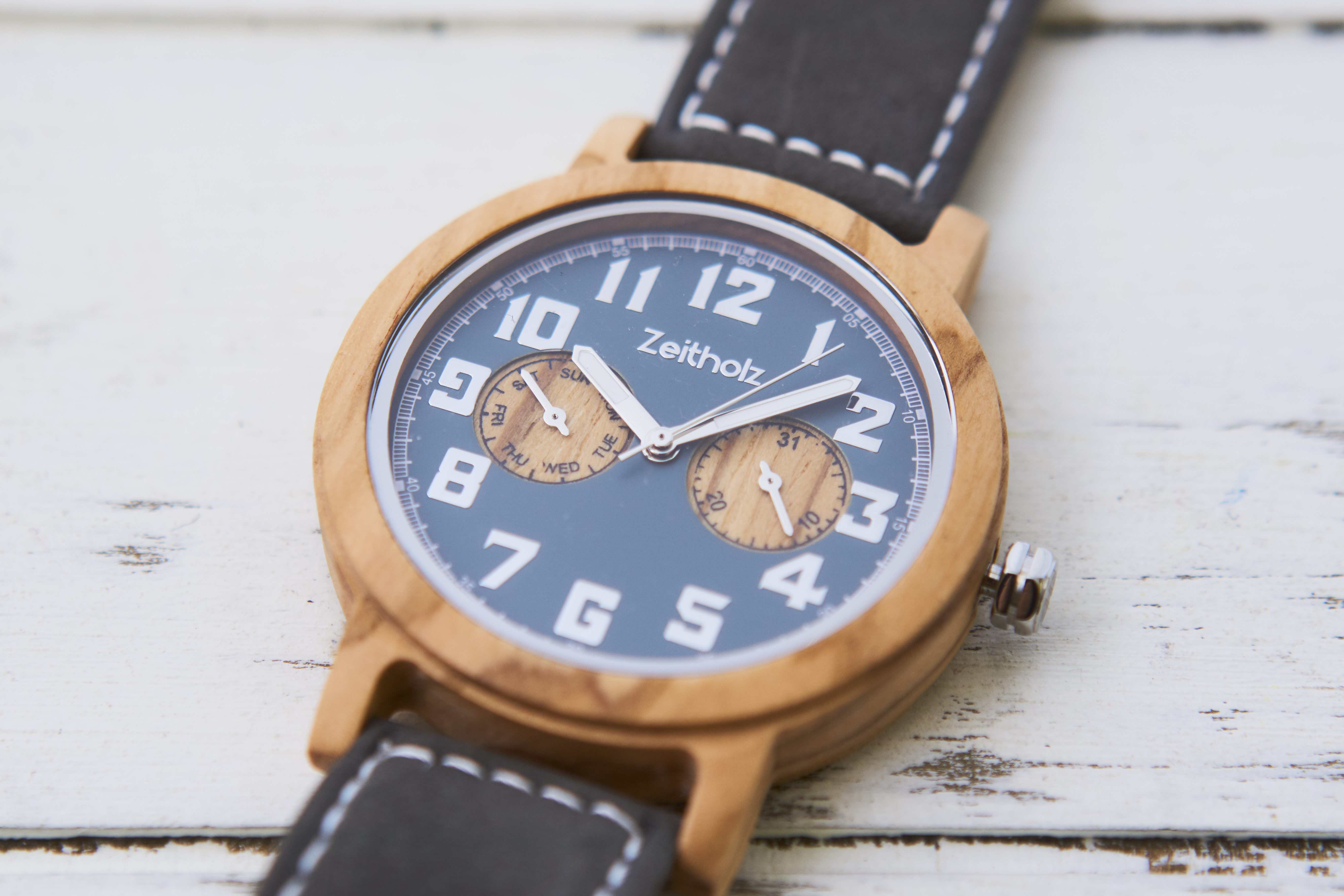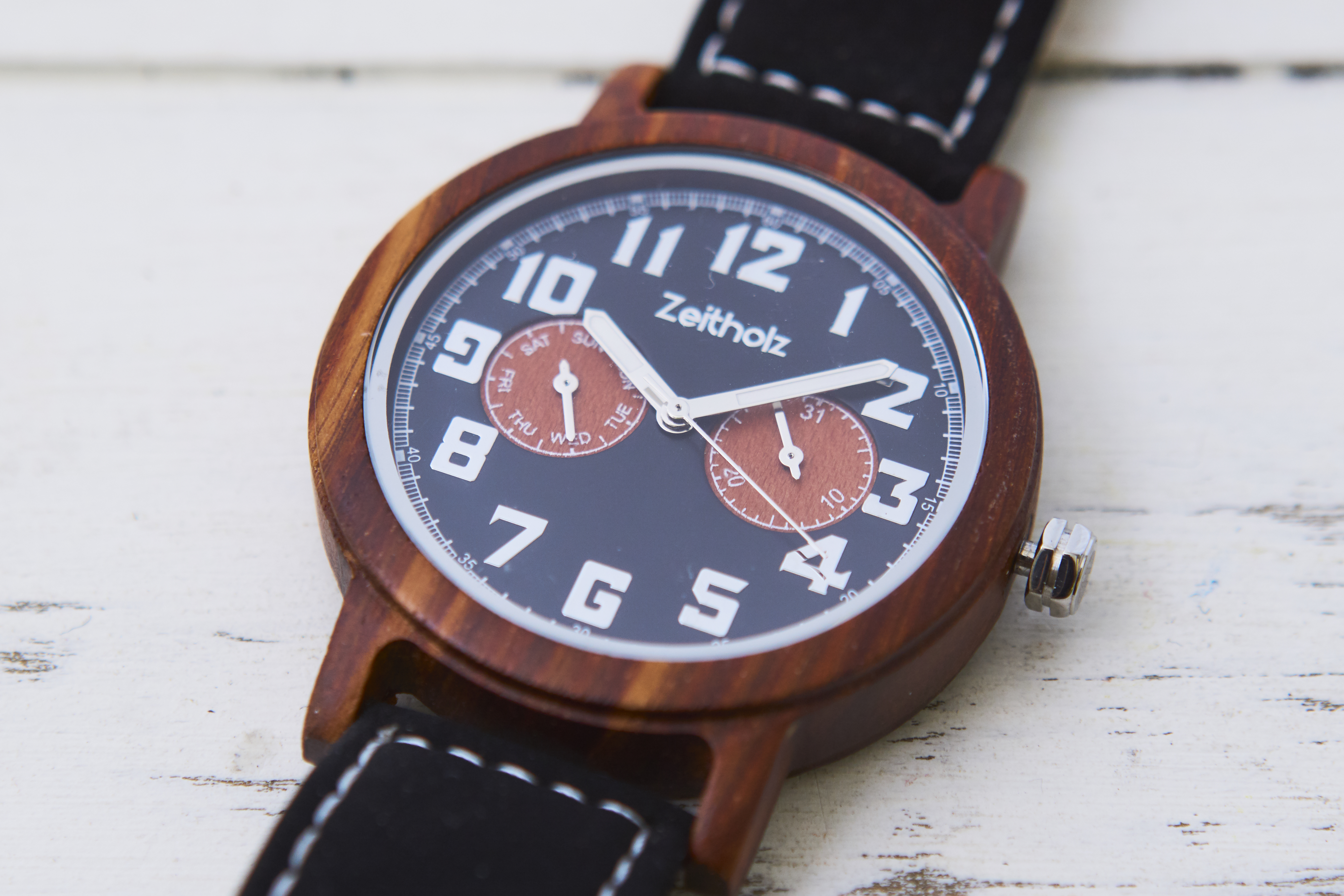 ドイツ発の木製腕時計ブランド【Zeitholz】の腕時計。モダンなデザインを取り入れた木×スウェードハンドモデルです。日付や曜日も確認でき、見る者を魅了するオシャレなモデルのKlingenbergです。木を素材に使用し、生活防水にも対応しています。